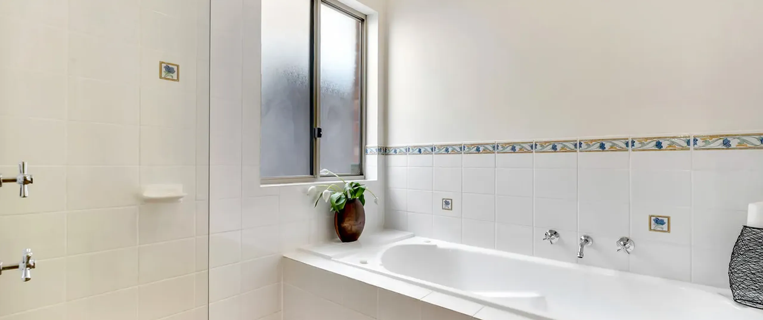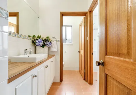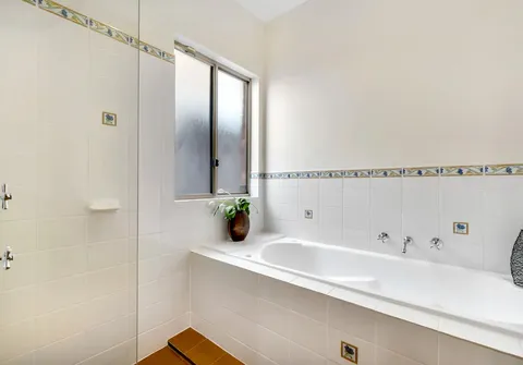 - Stylish 3 way bathroom, containing; separate toilet, inset basin, frameless shower screen, feature tiling and tiled surround to spa