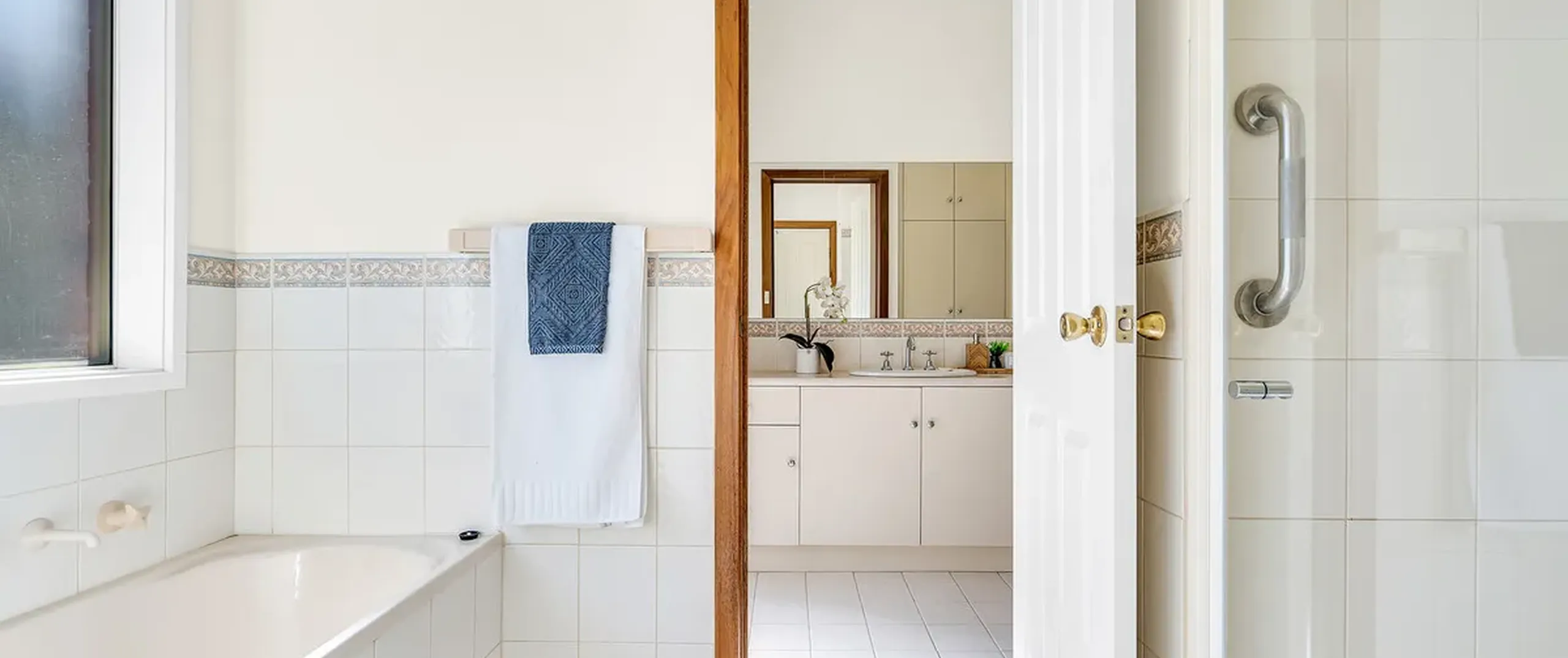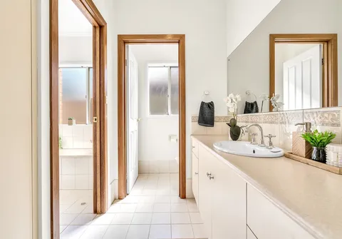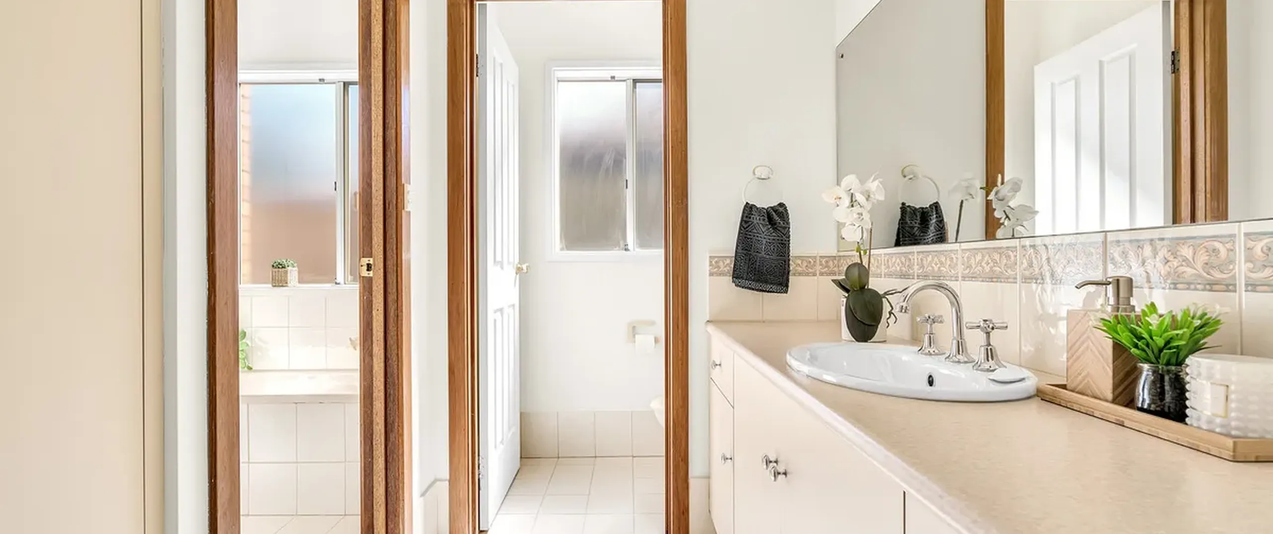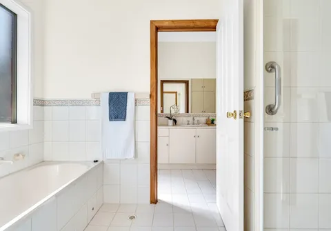 - Three-way main bathroom with newly installed shower screen, separate vanity and toilet