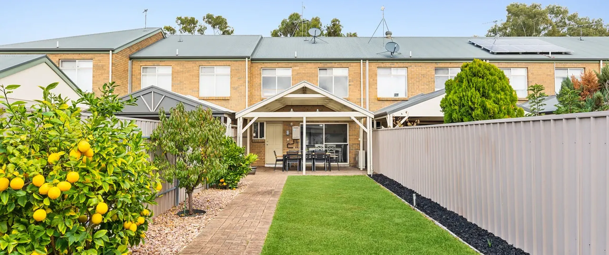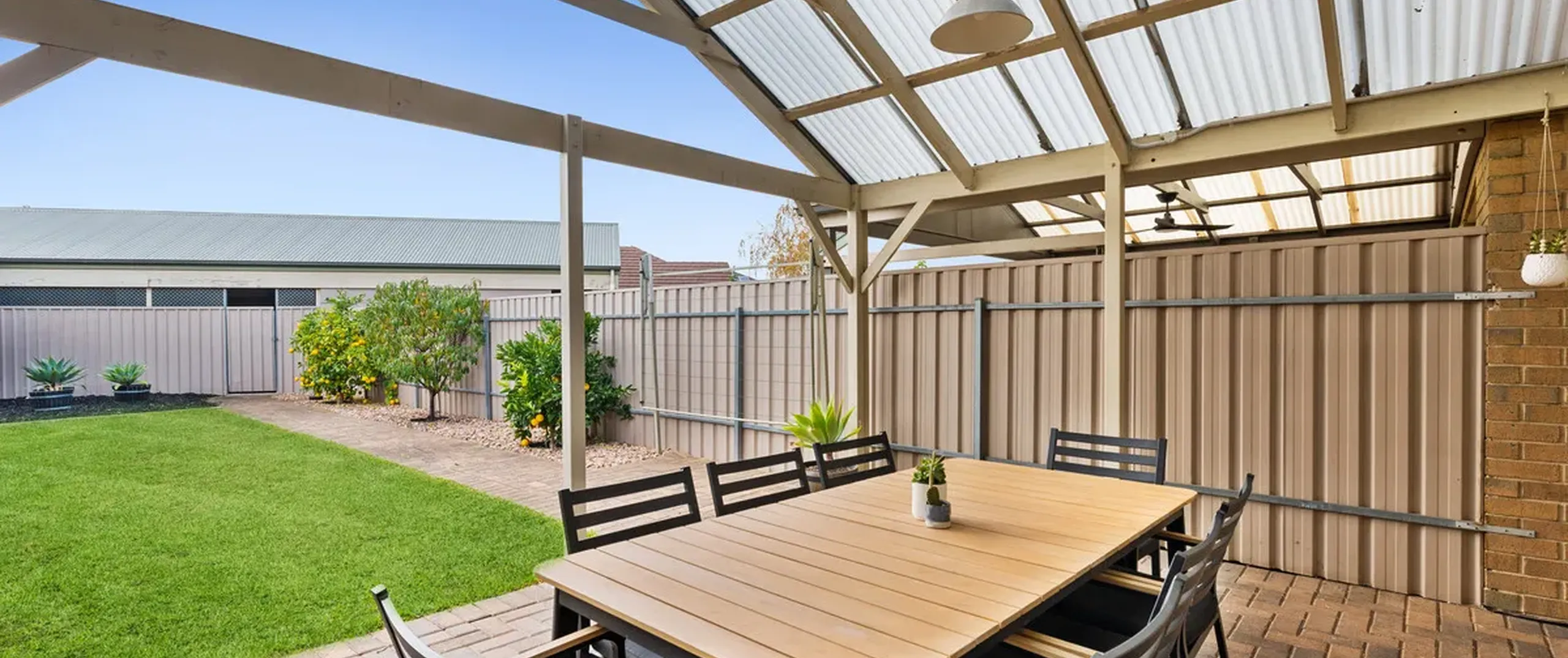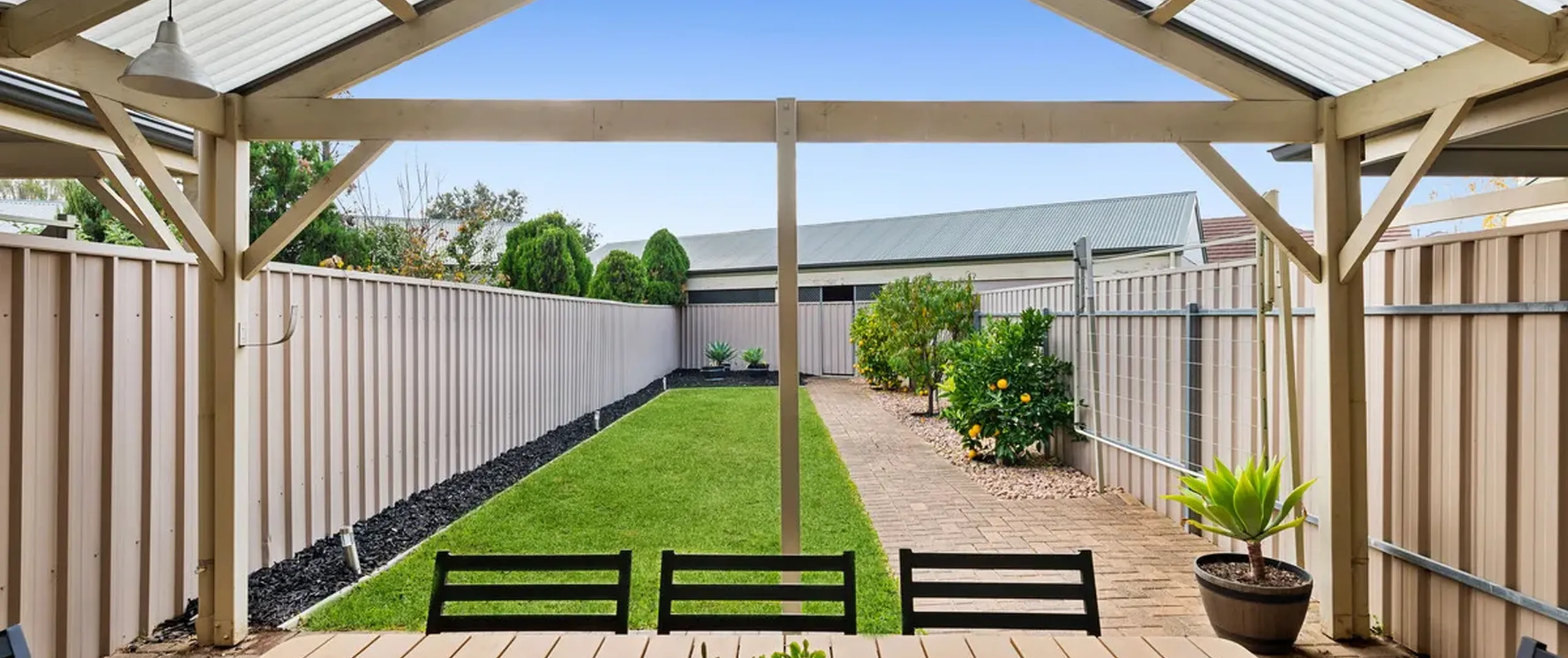 - Large outdoor entertaining space with pitched roof pergola, perfect for hosting guests in style