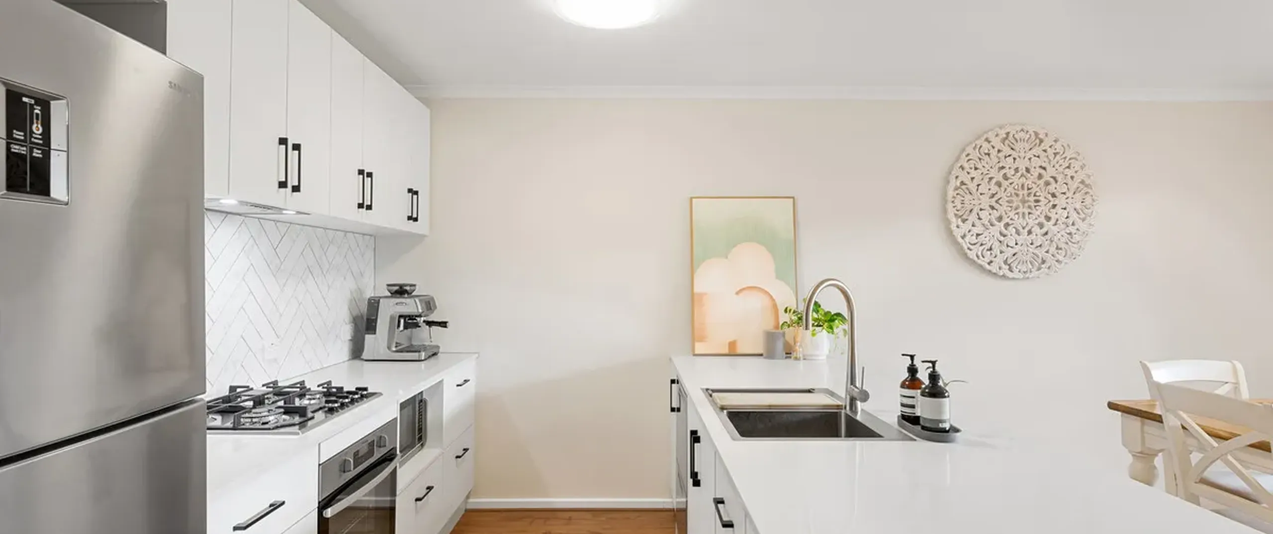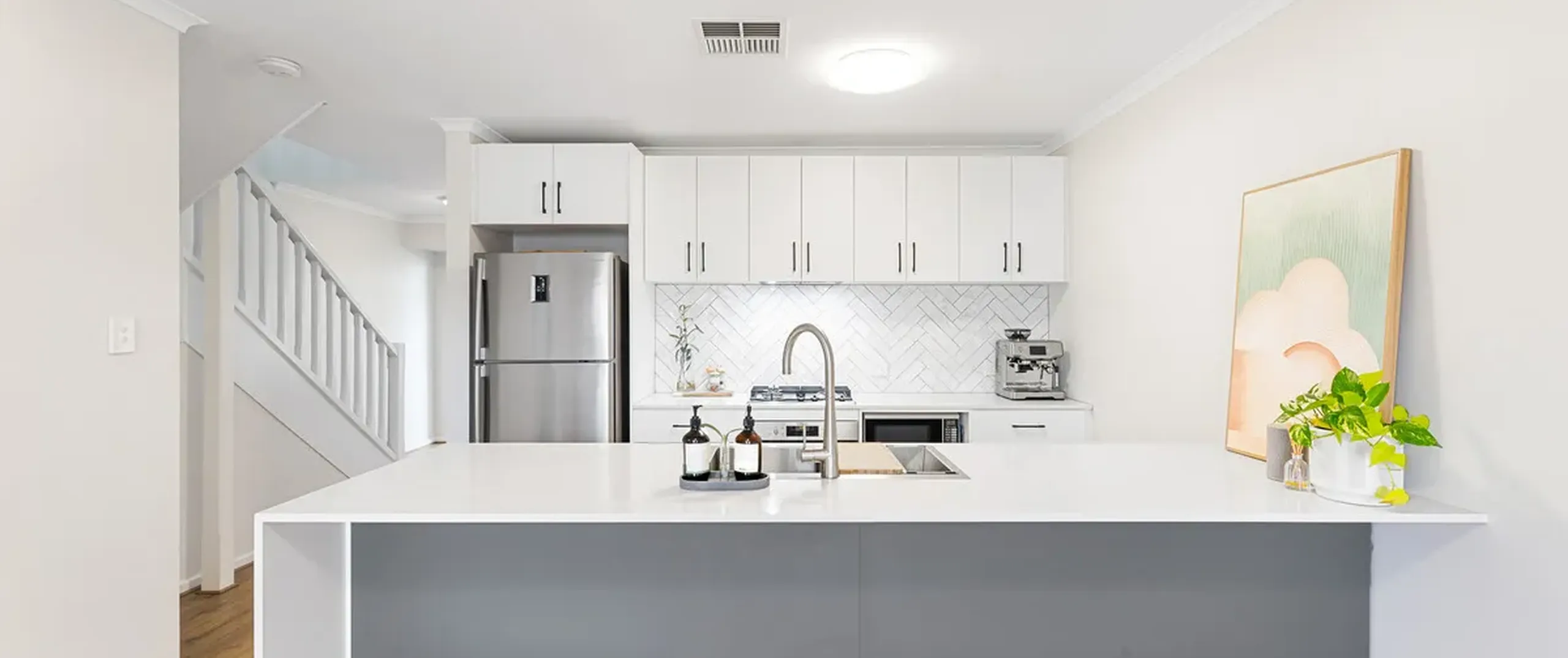 - Updated and stylish kitchen with stainless steel appliances including dishwasher, gas cooktop, breakfast bar, Ceaserstone benchtops and herringbone style splashback