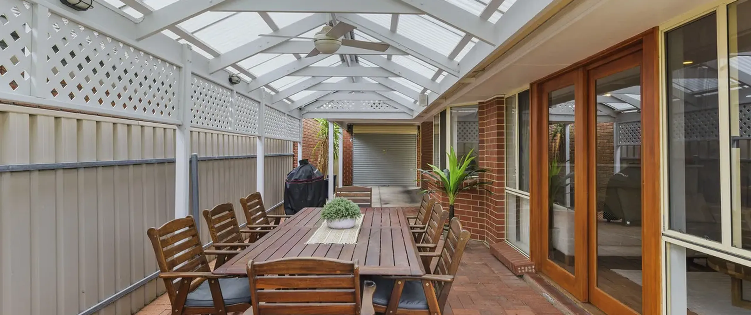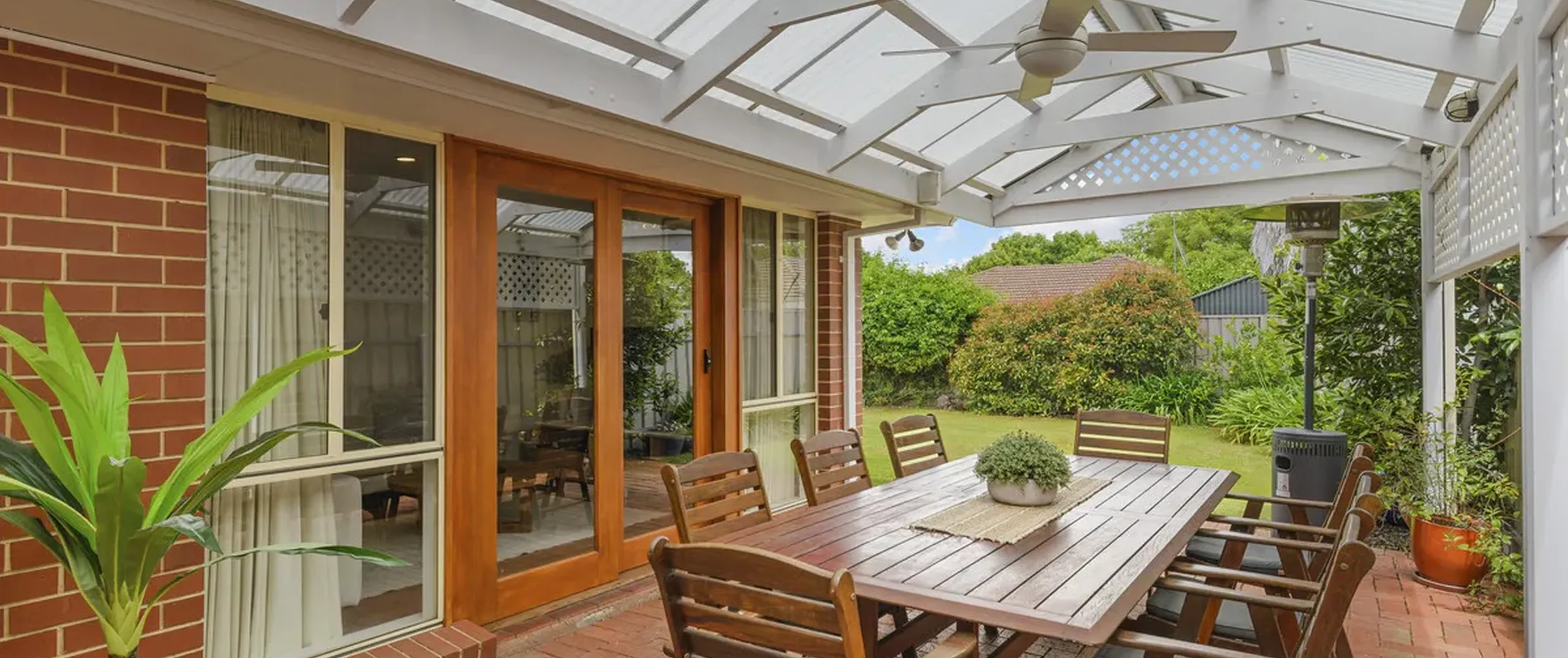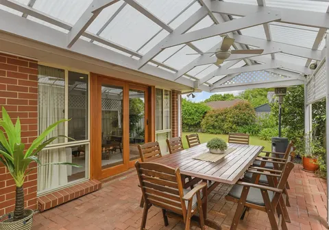 - Large outdoor entertaining area with pitched roof pergola and ceiling, making year-round entertaining ideal