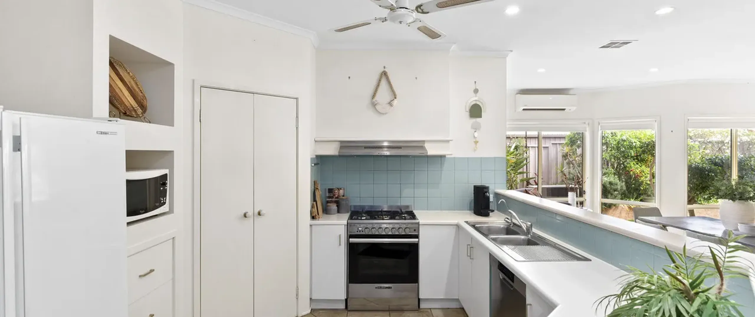 - Timeless kitchen featuring stainless steel dishwasher and standalone 5 burner gas cooktop and oven, walk-in corner pantry, double sink with a mixer tap and puratap, ample cupboard and bench space + ceiling fan