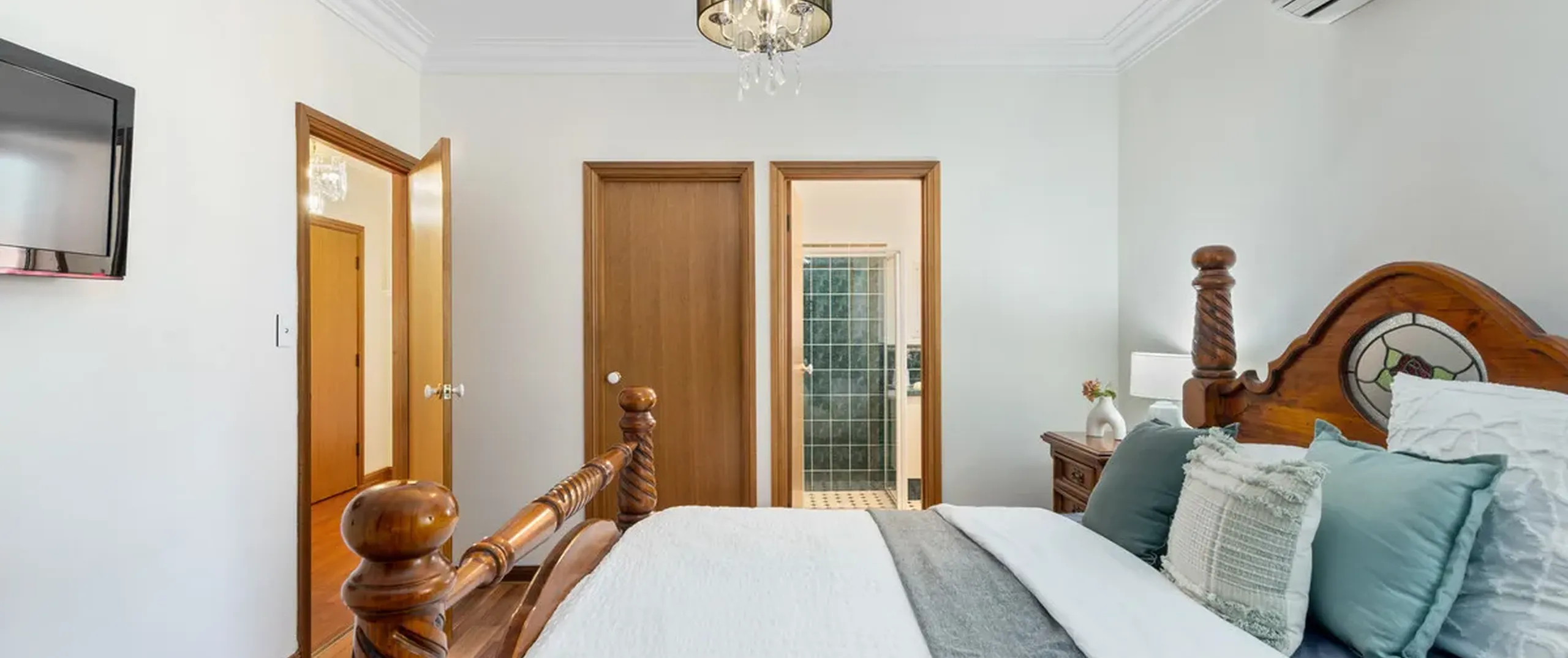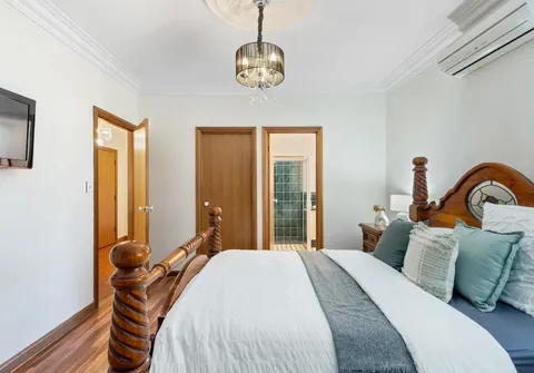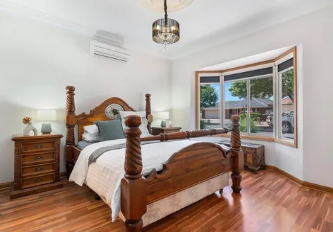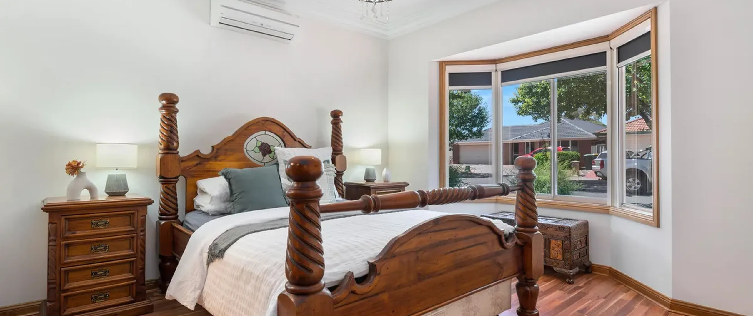 - Master bedroom located at the front of the home flooded with natural light from the bay window, complete with a walk-in robe, ensuite and split system air conditioner