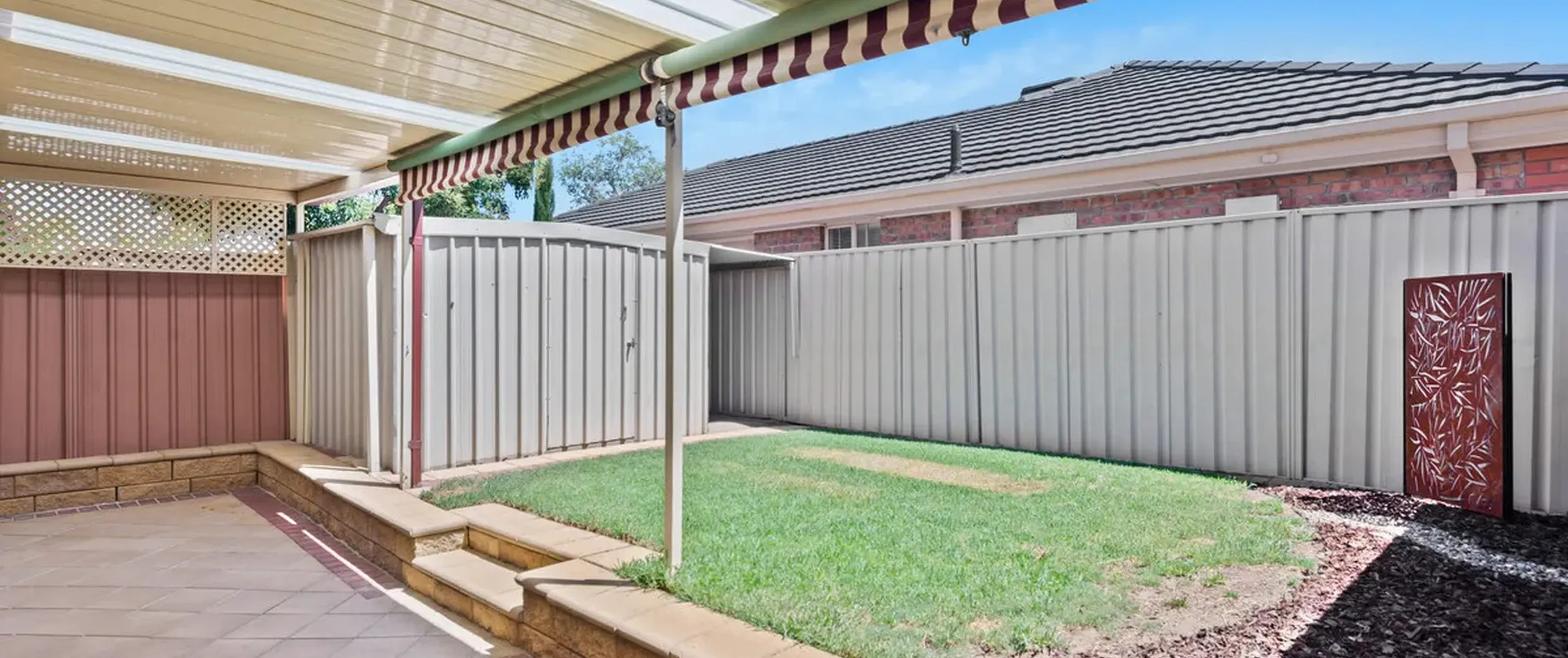 - Low-maintenance backyard with garden shed and room for kids and pets to play
