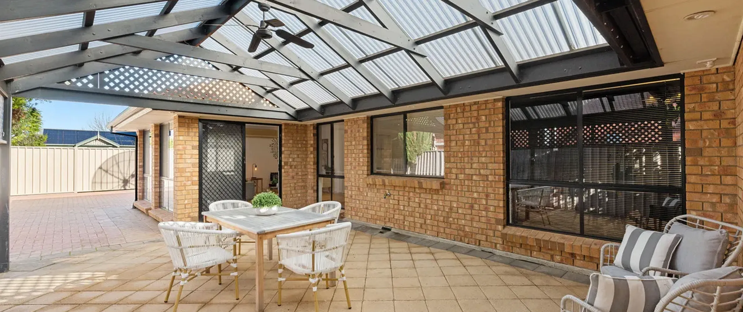 Outside, a paved undercover courtyard awaits, offering a picturesque space for year-round entertainment and relaxation. Whether you're hosting a barbecue with friends or enjoying a quiet evening under the stars, this outdoor area provides the perfect setting to unwind and create lasting memories.