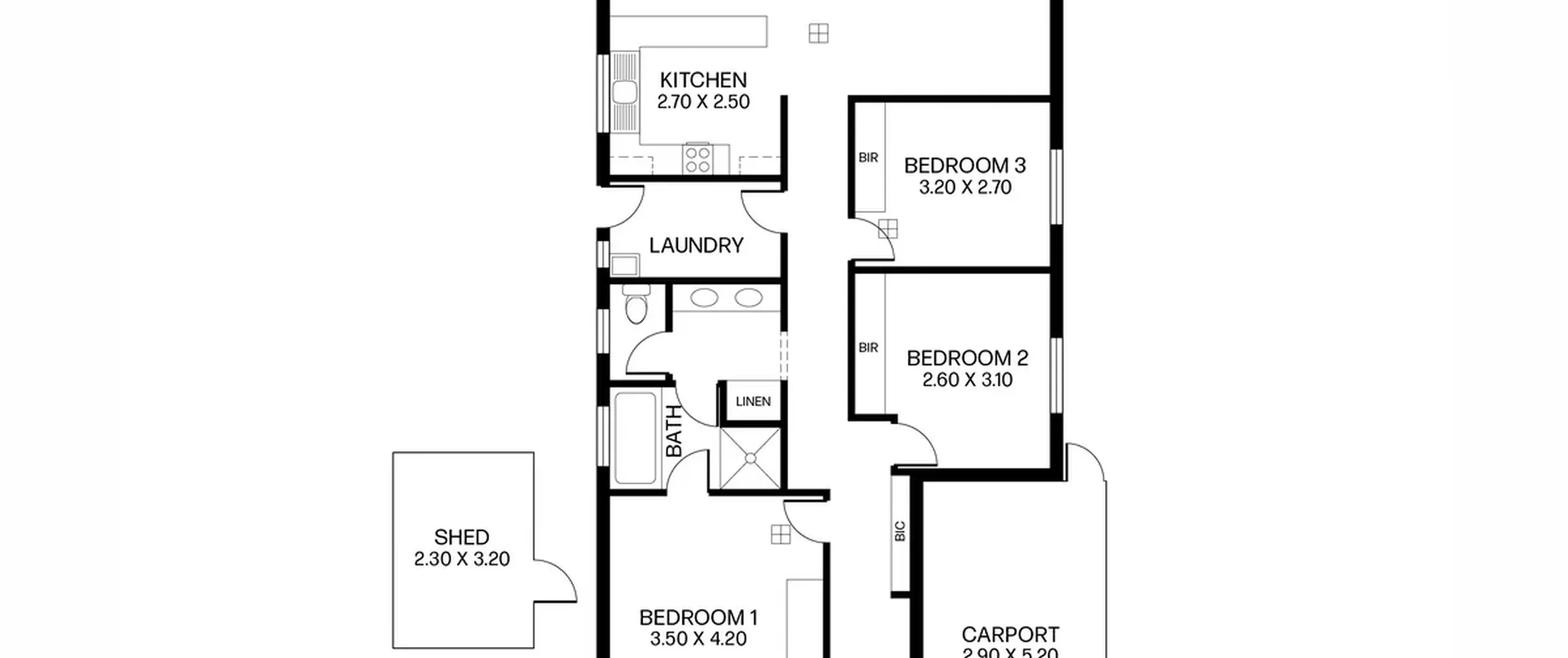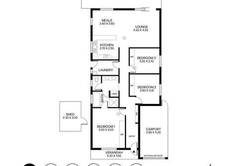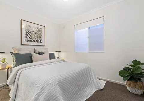 The functional layout extends to the bedrooms, including a master bedroom generously lit by natural light. All bedrooms boast ample space, and the bathroom features timeless design elements. The layout is completed by a single carport featuring an automatic roller door.