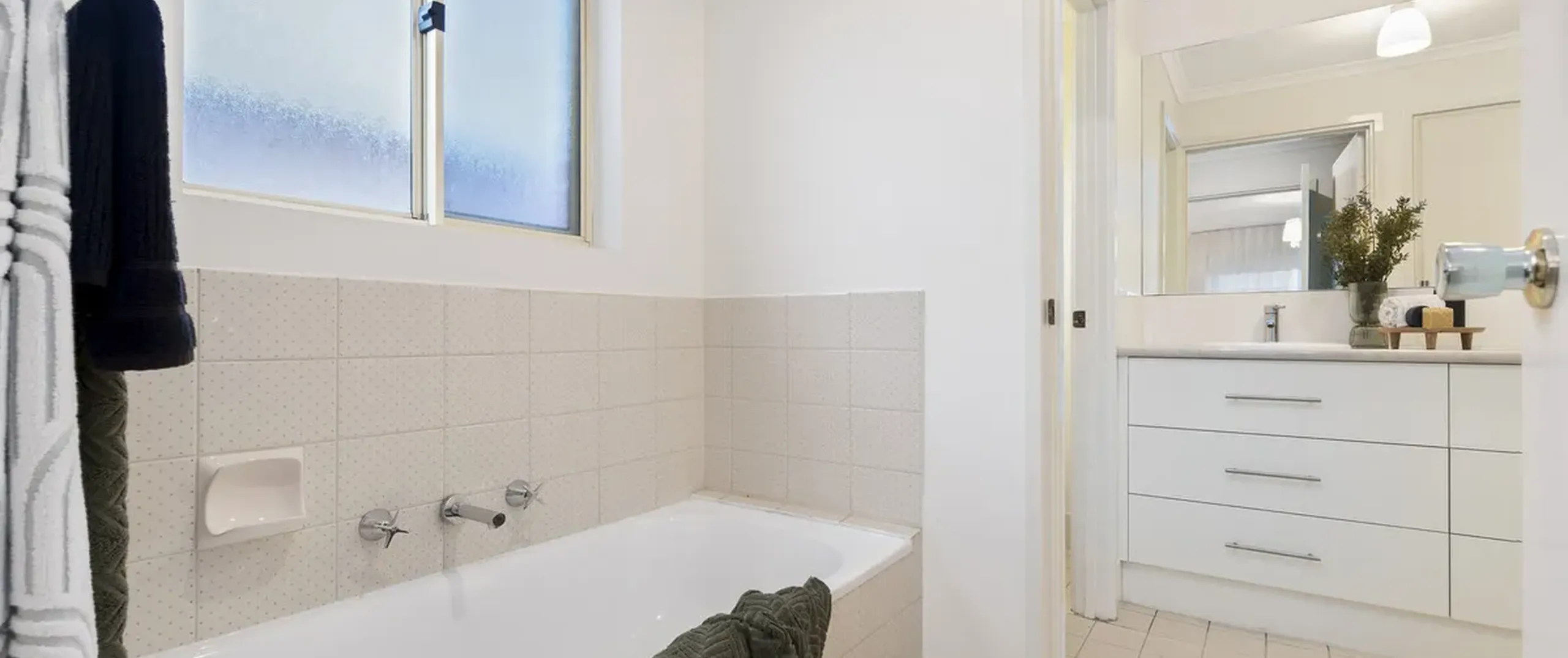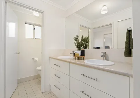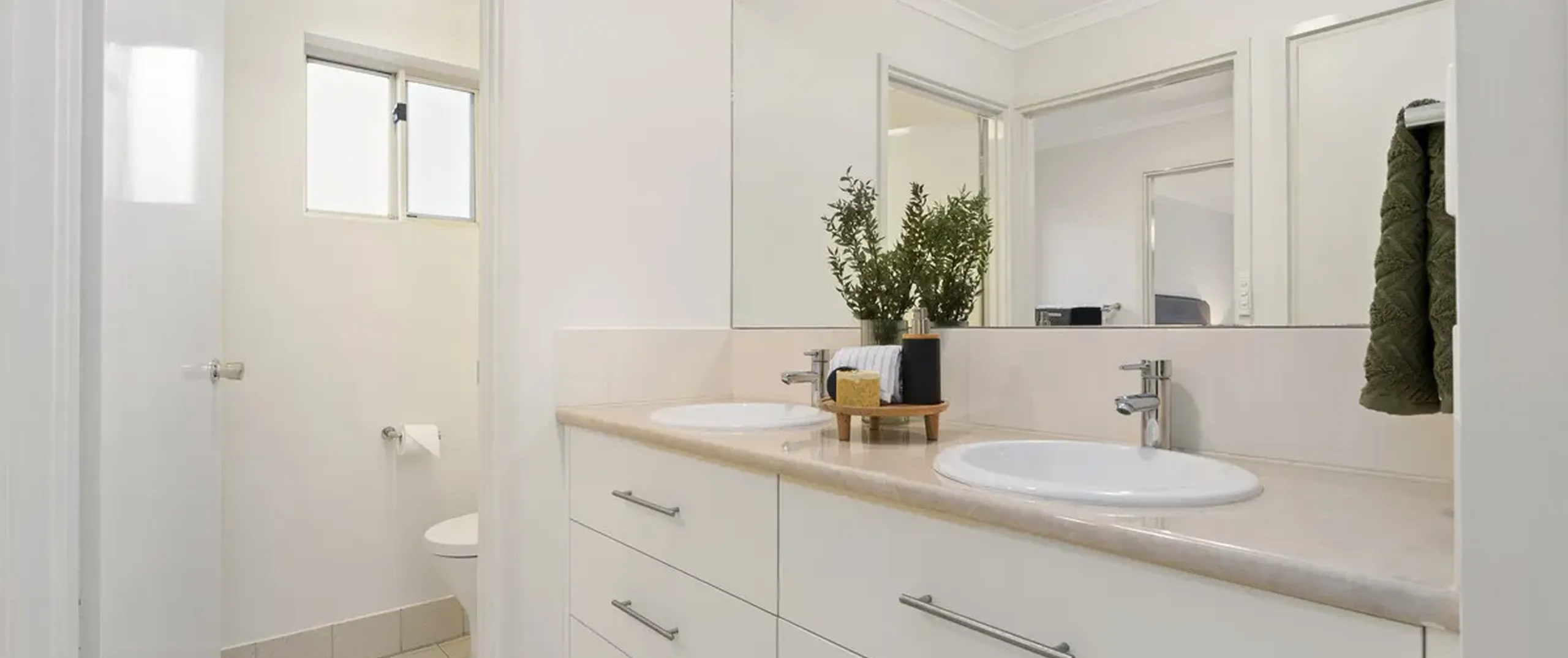 - Neutral main bathroom with dual basins, shower, bath, and separate toilet for added convenience