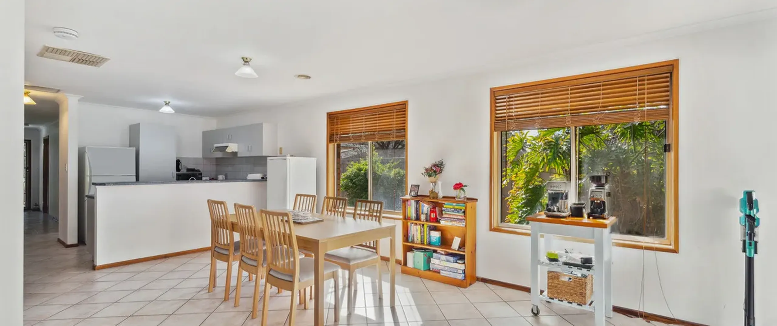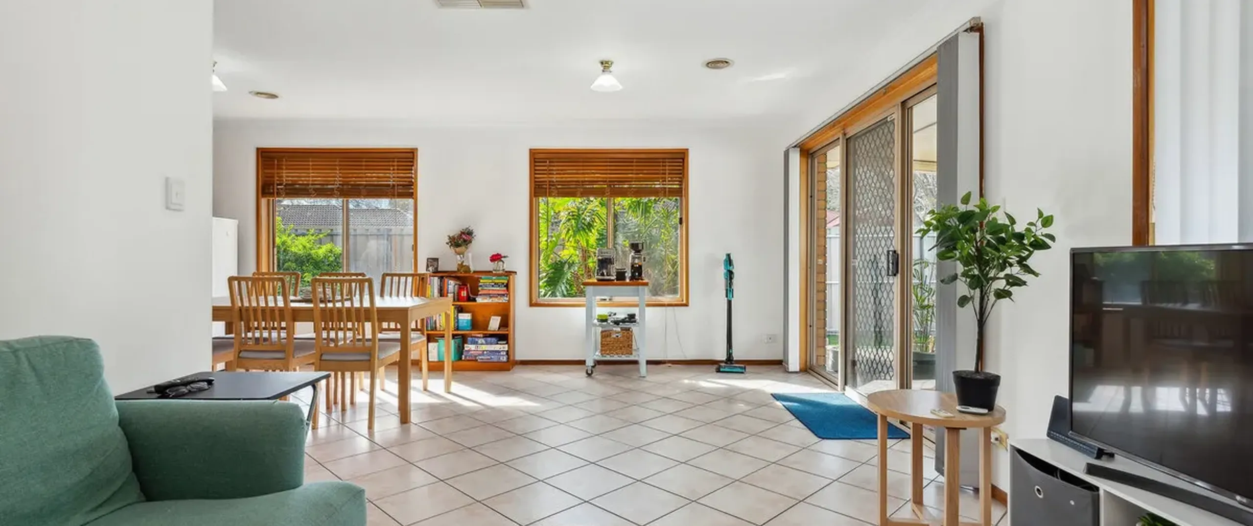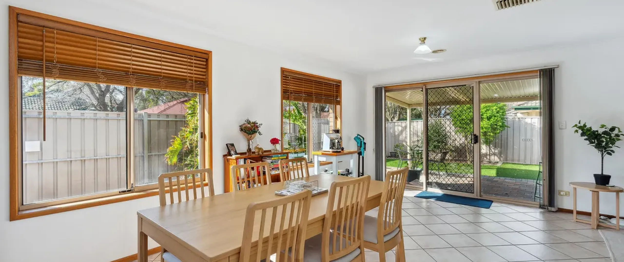 - Light filled family, meals, and lounge areas equipped with ducted air conditioner and glass sliding doors connect these spaces to the verandah