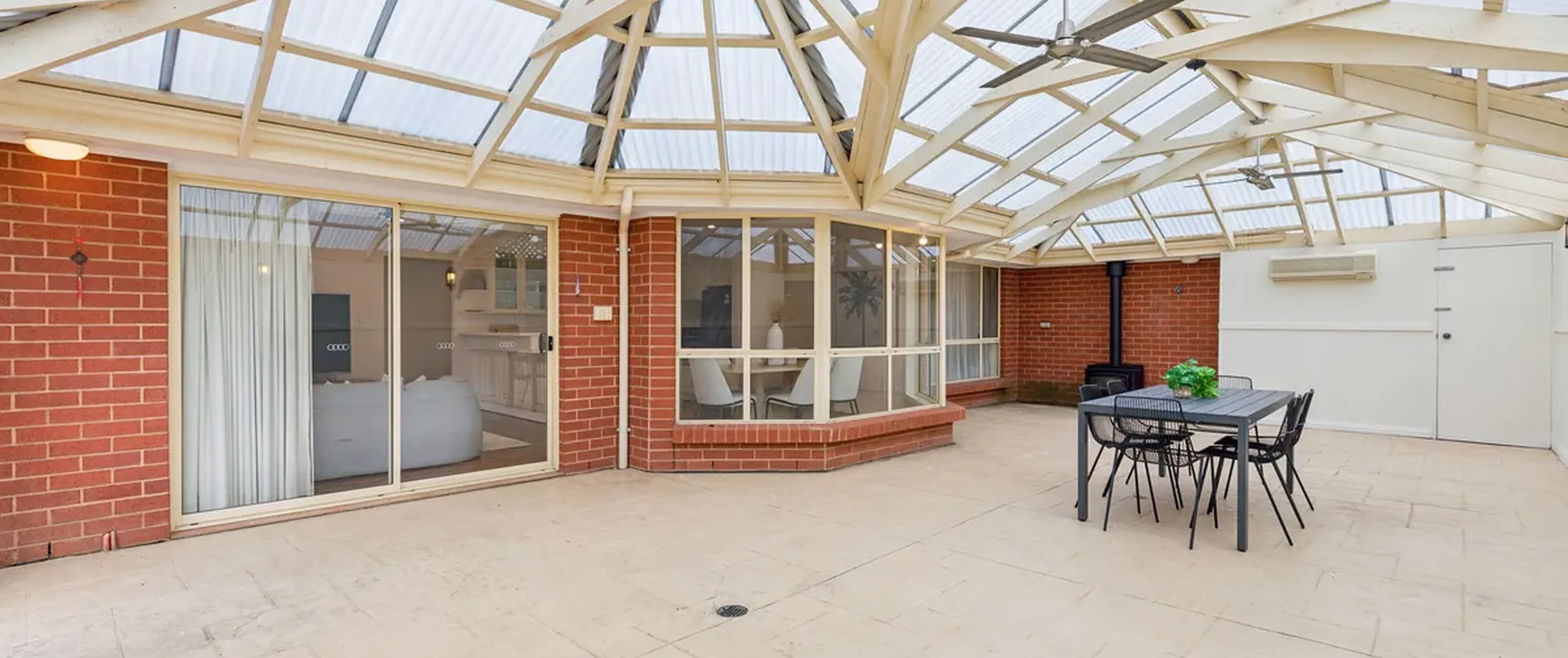 Outdoors, a fantastic, patterned concrete entertaining area beneath a gable roof pergola is the perfect setting for weekend barbecues. Complete with split system air conditioning and a wood fire heater, this is an ideal spot year round.
