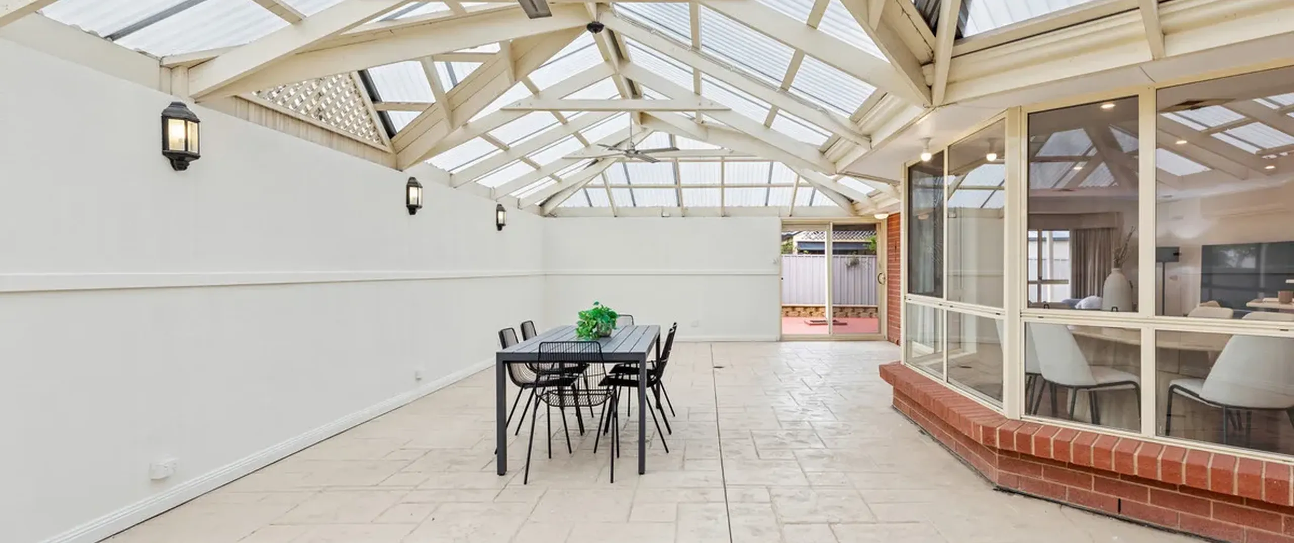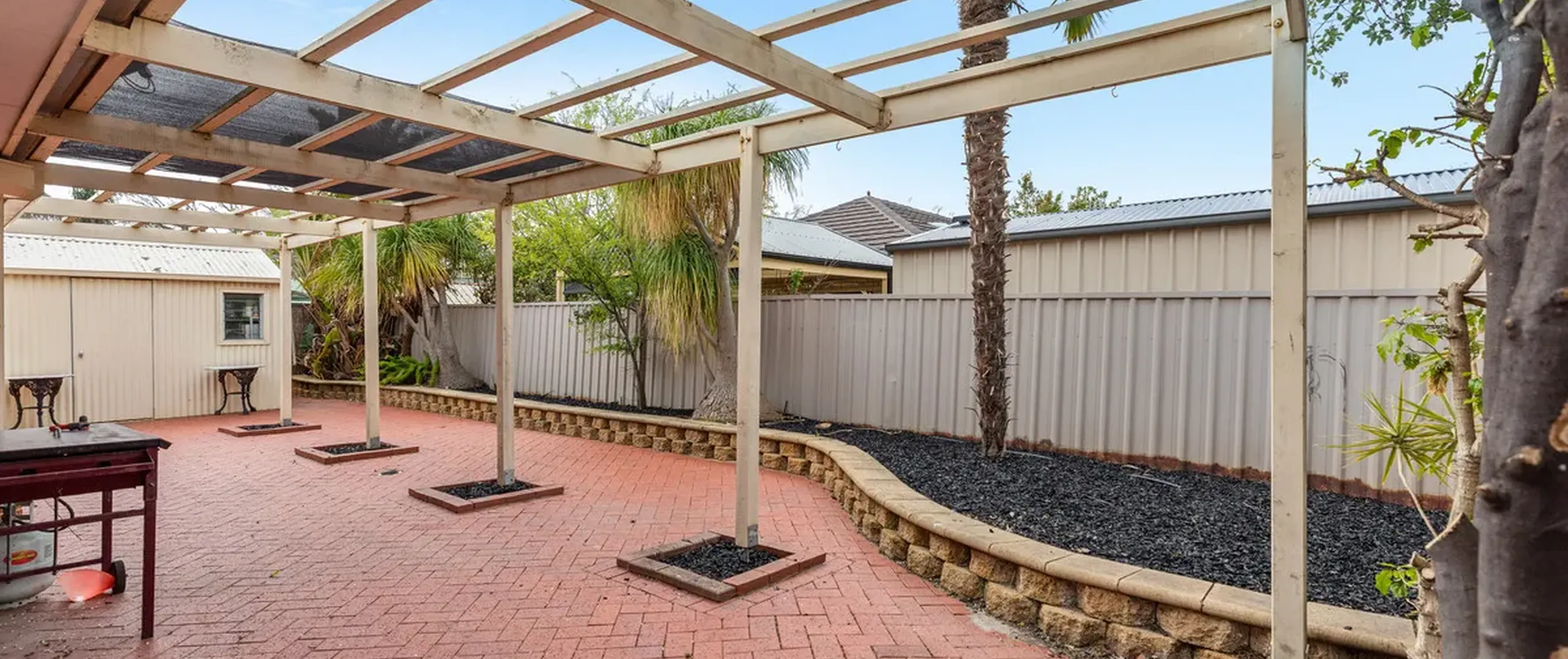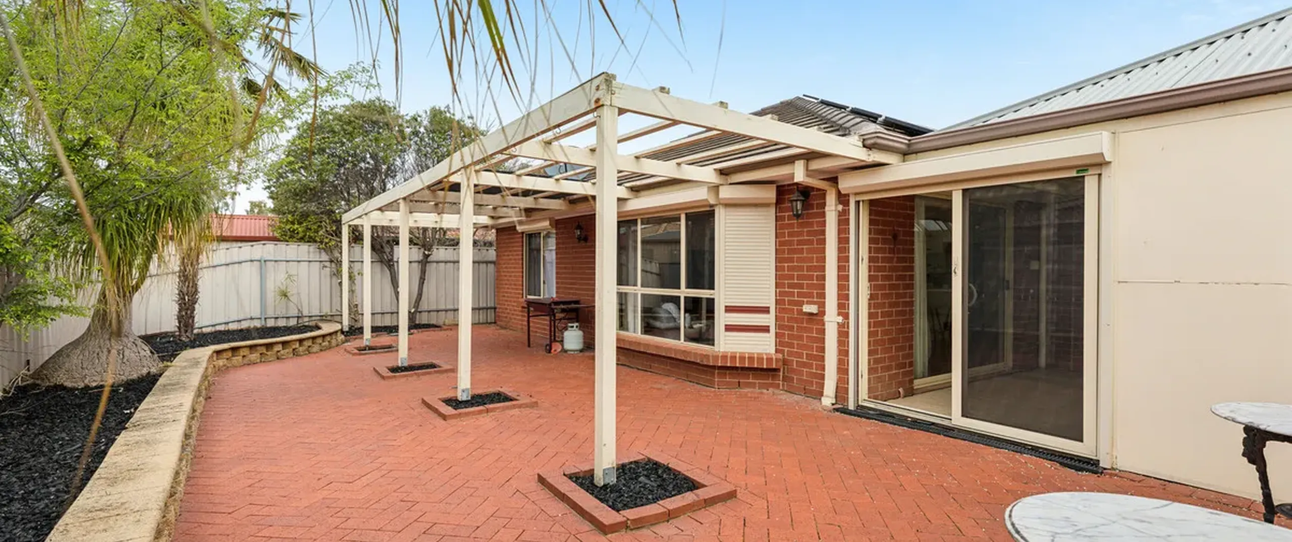 - Large outdoor entertaining with patterned concrete and pergola