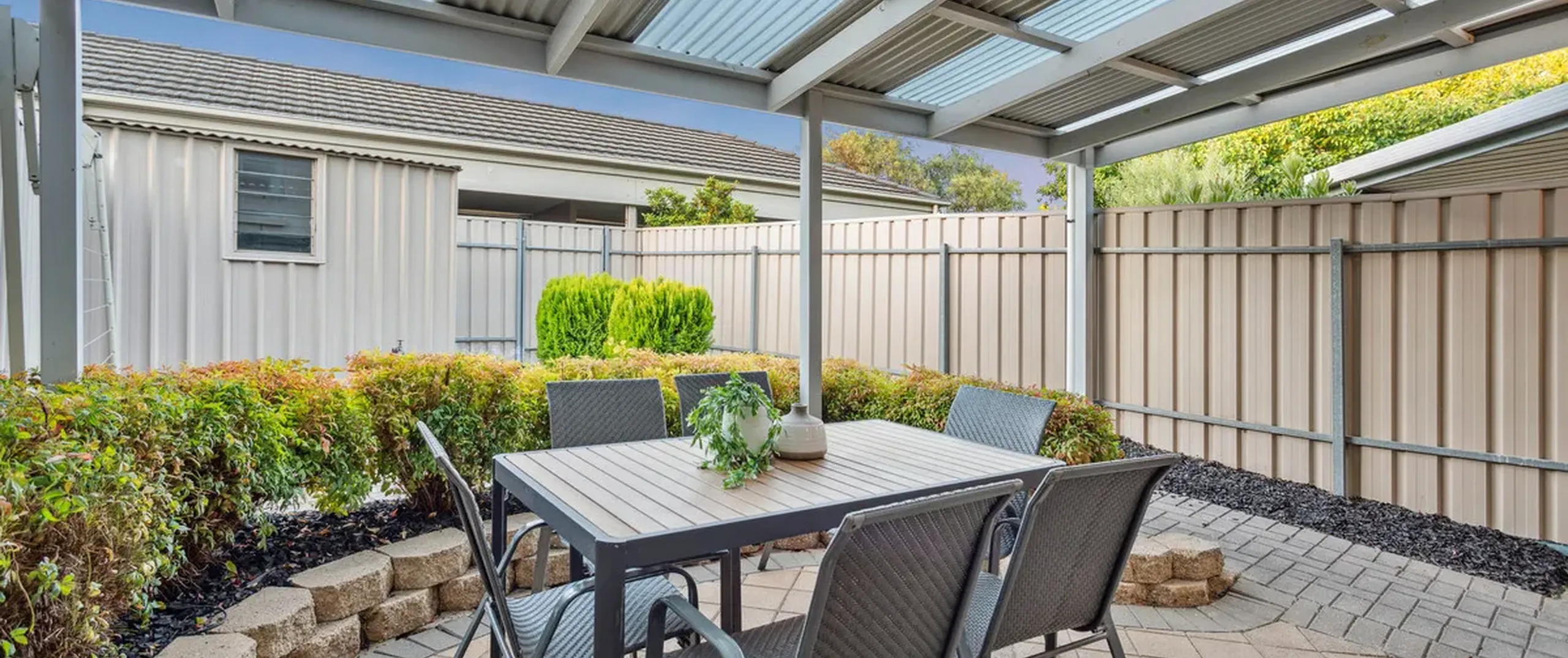 - Double carport with roller door access via a private lane for added ease and security