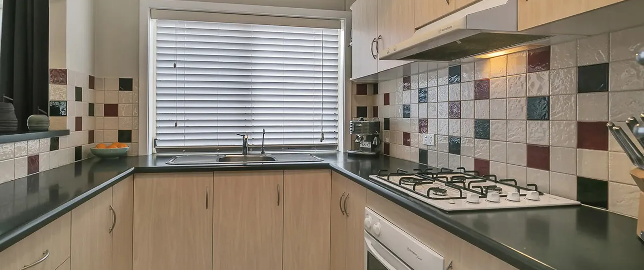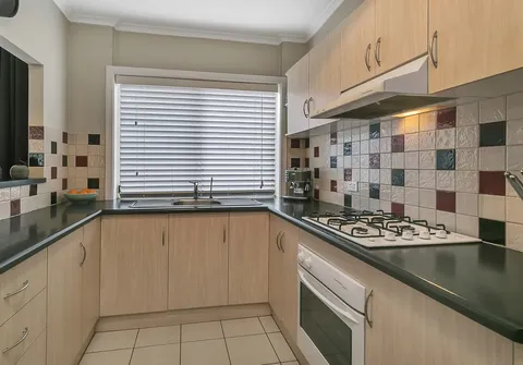 - Functional kitchen with gas cooking, ample bench and cupboard space and servery to dining area