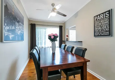 - Designated dining area with ceiling fan