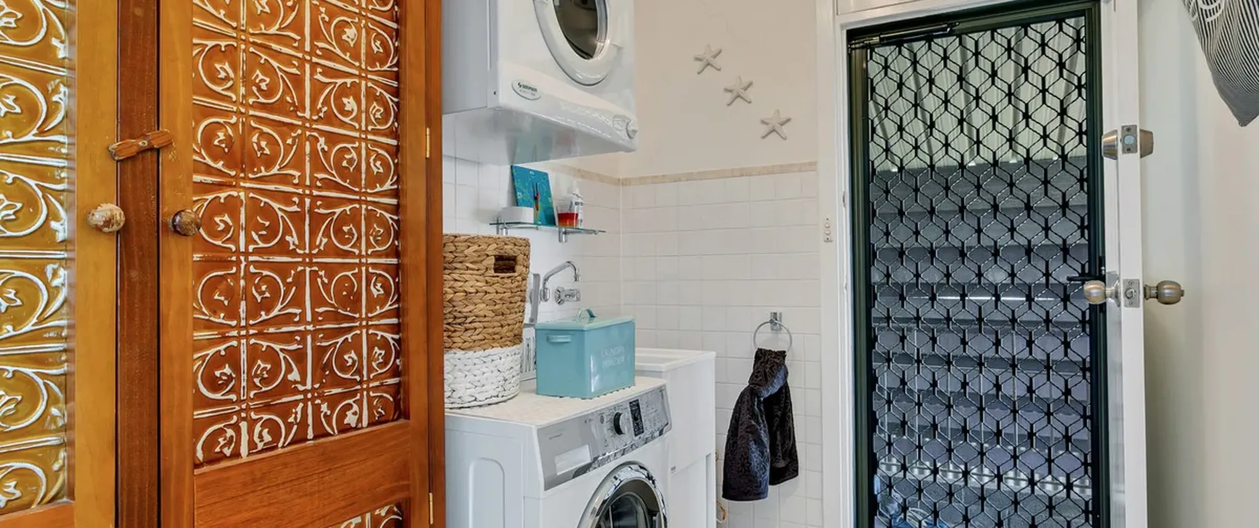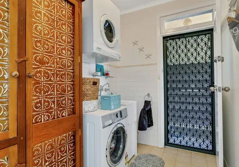 - Separate laundry with ample storage space and rear access (dryer on wall is included in sale)