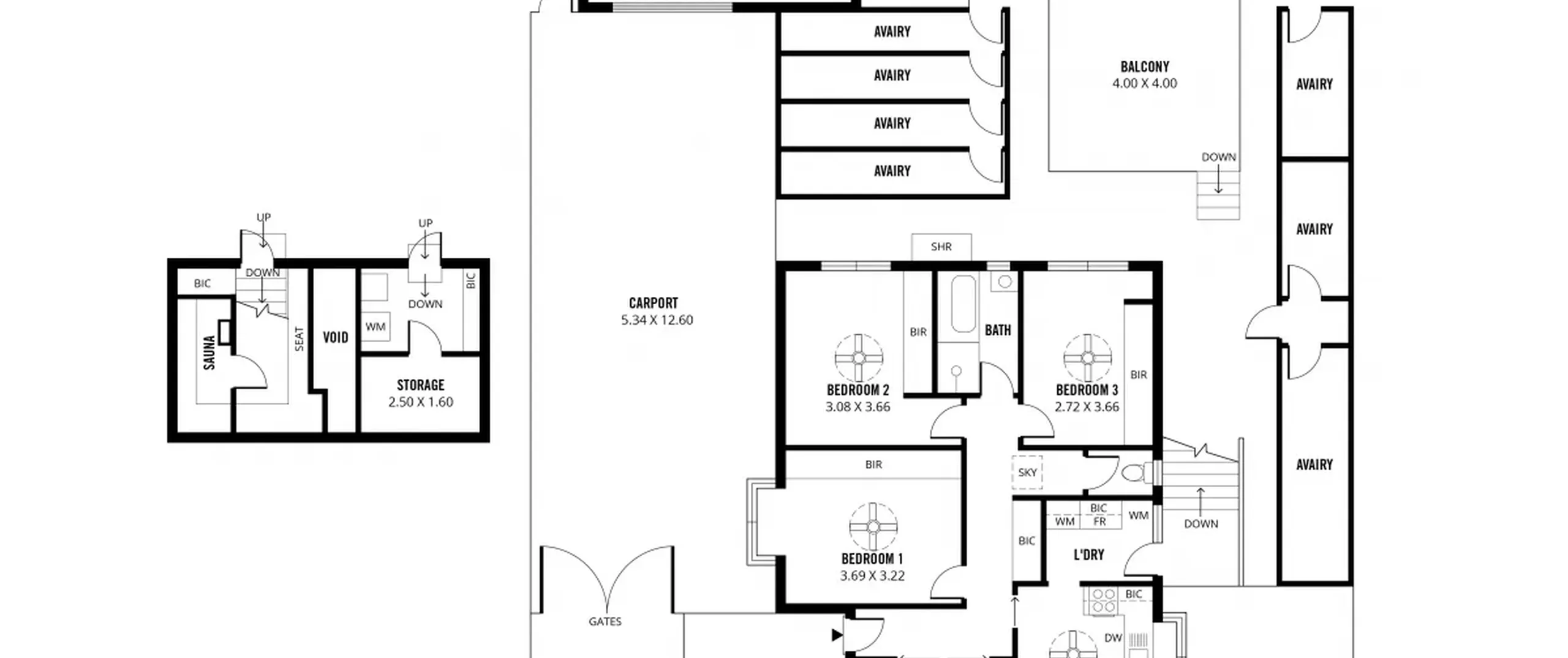 - Large fully fenced yard with multiple aviaries, raised decked balcony, and spa