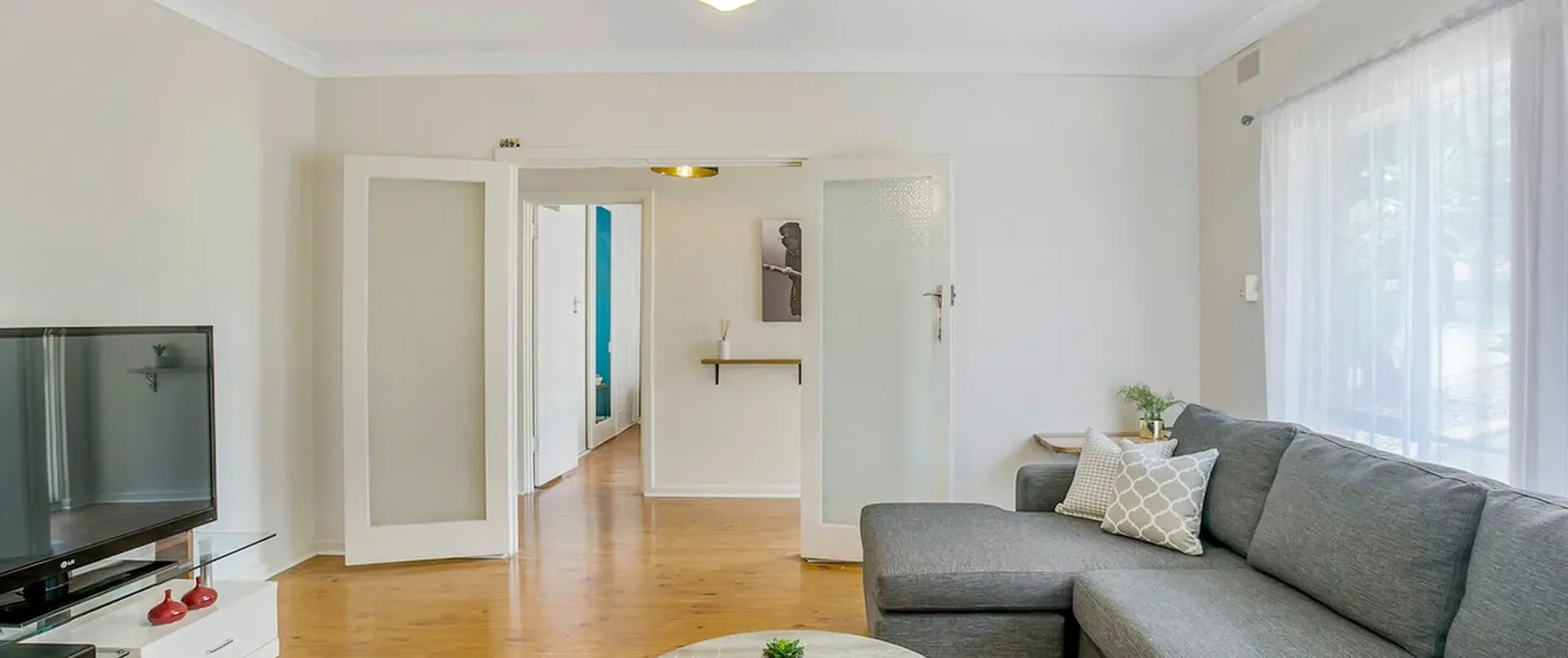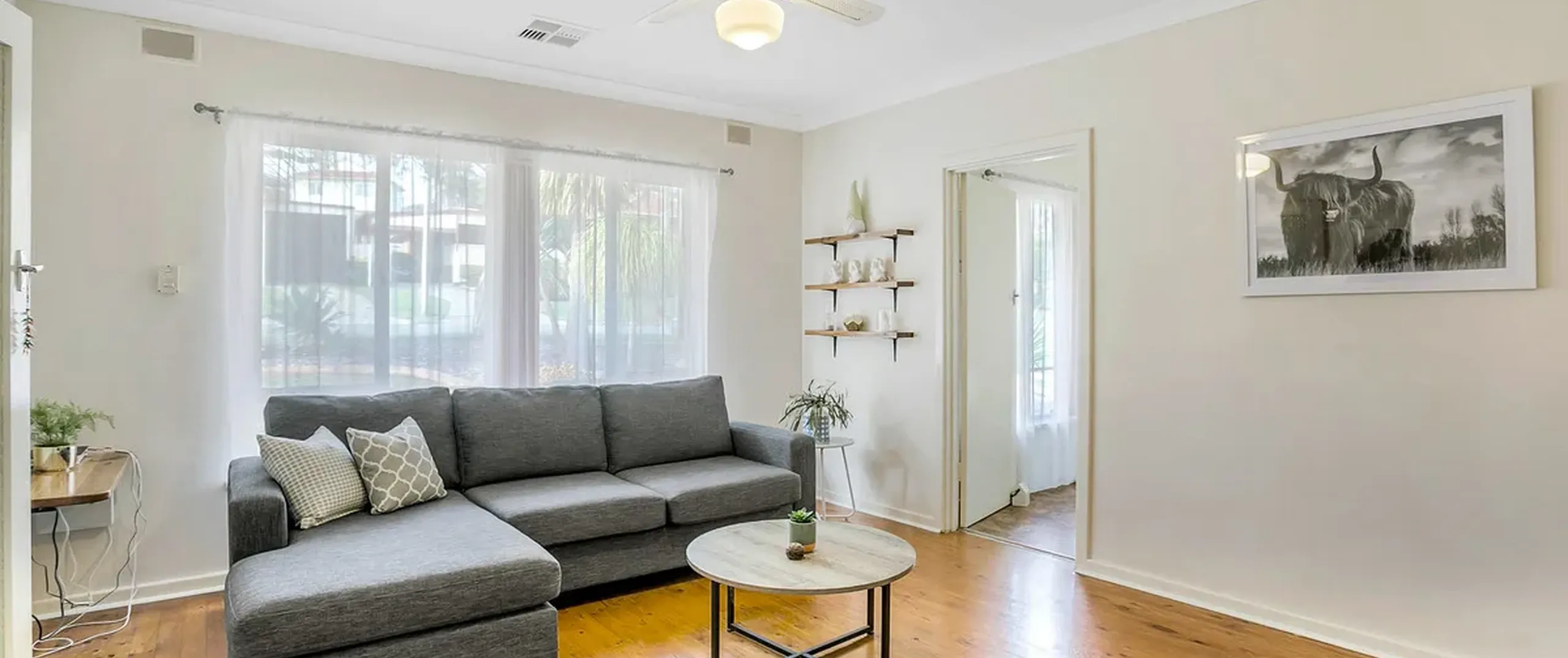 - Light filled lounge with ceiling fan and gas heater