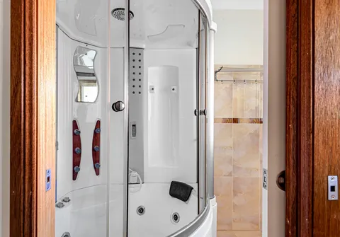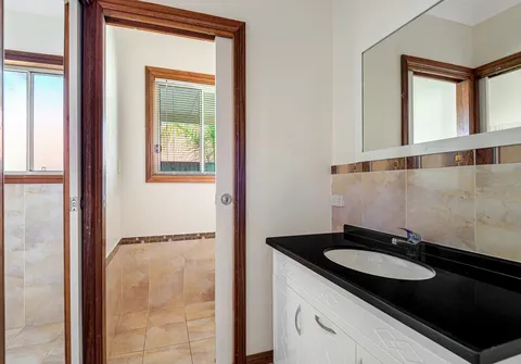 - Three-way bathroom with spa bath, stone bench top + separate toilet