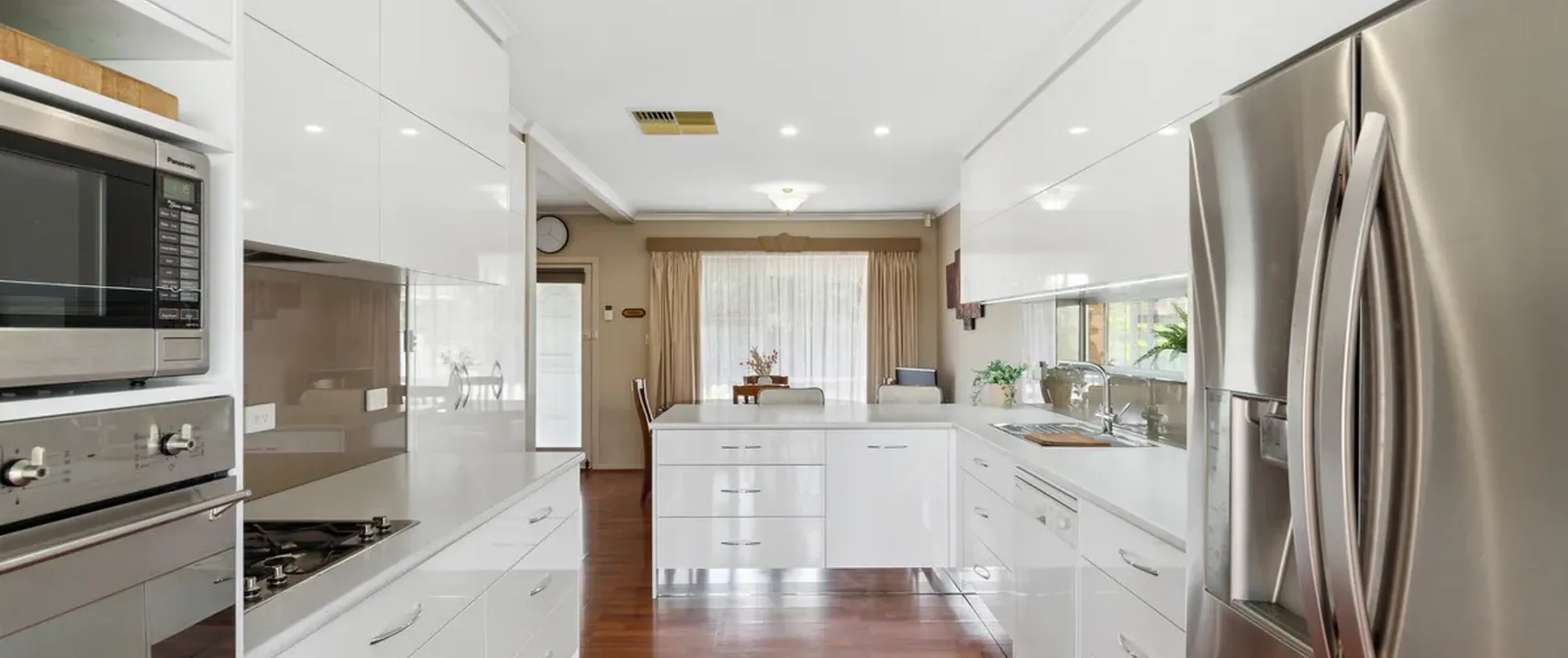 - Pristine and modern kitchen featuring on-trend splashback, a suite of stainless-steel appliances including gas cooktop, oven, and dishwasher, with a desirable walk-in pantry and ample cupboard and bench space with a breakfast bar for on-the-go mornings