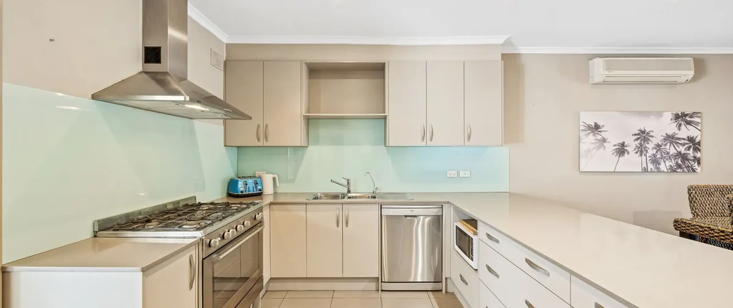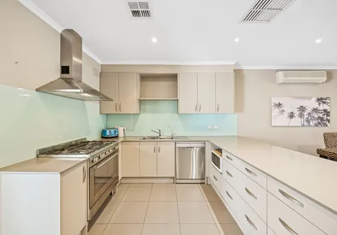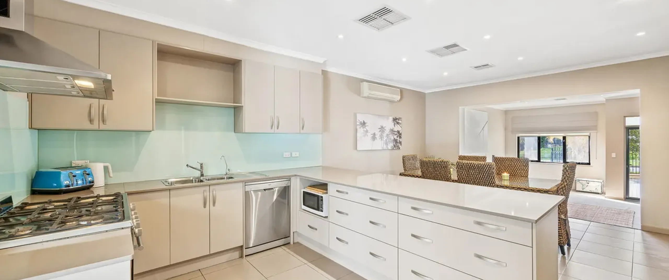 - Kitchen with gas cooktop, stainless steel oven and dishwasher, Puratap and breakfast bar