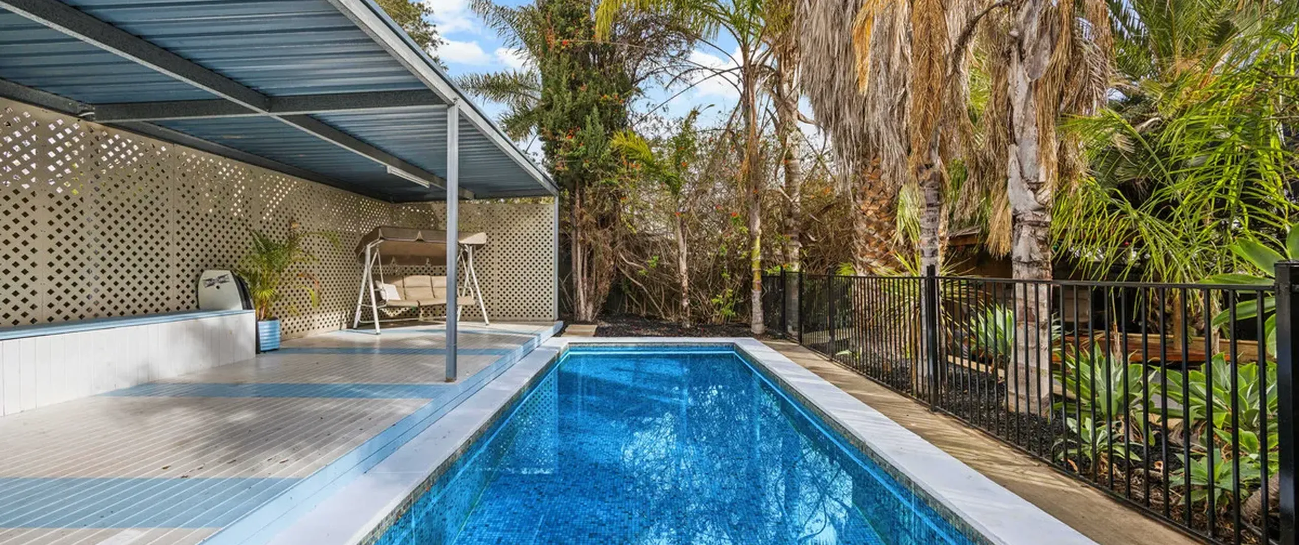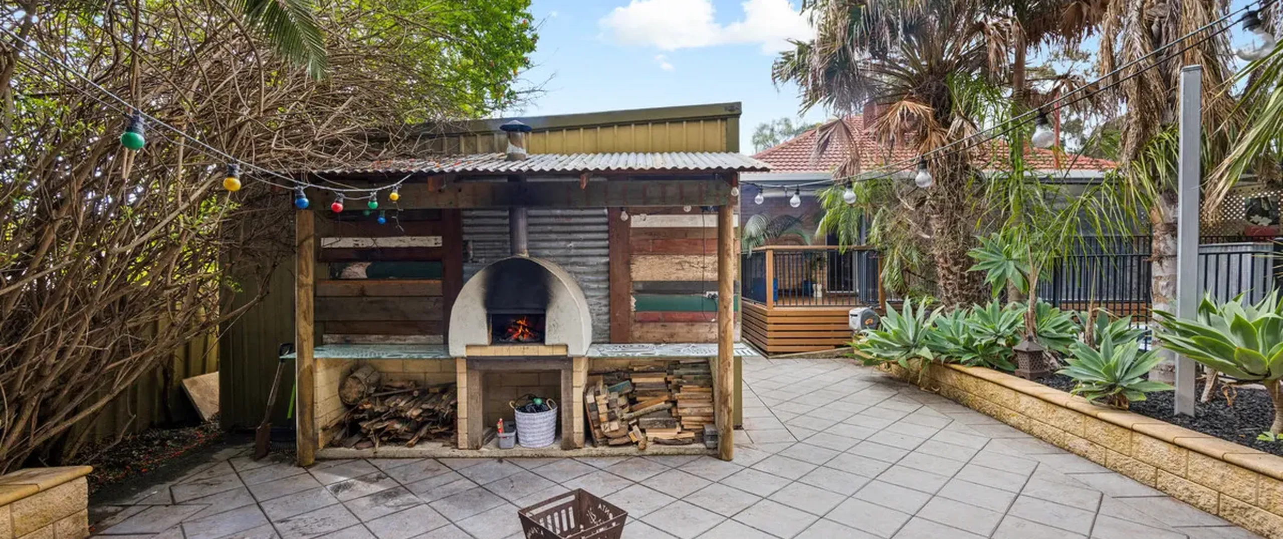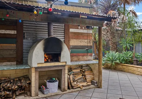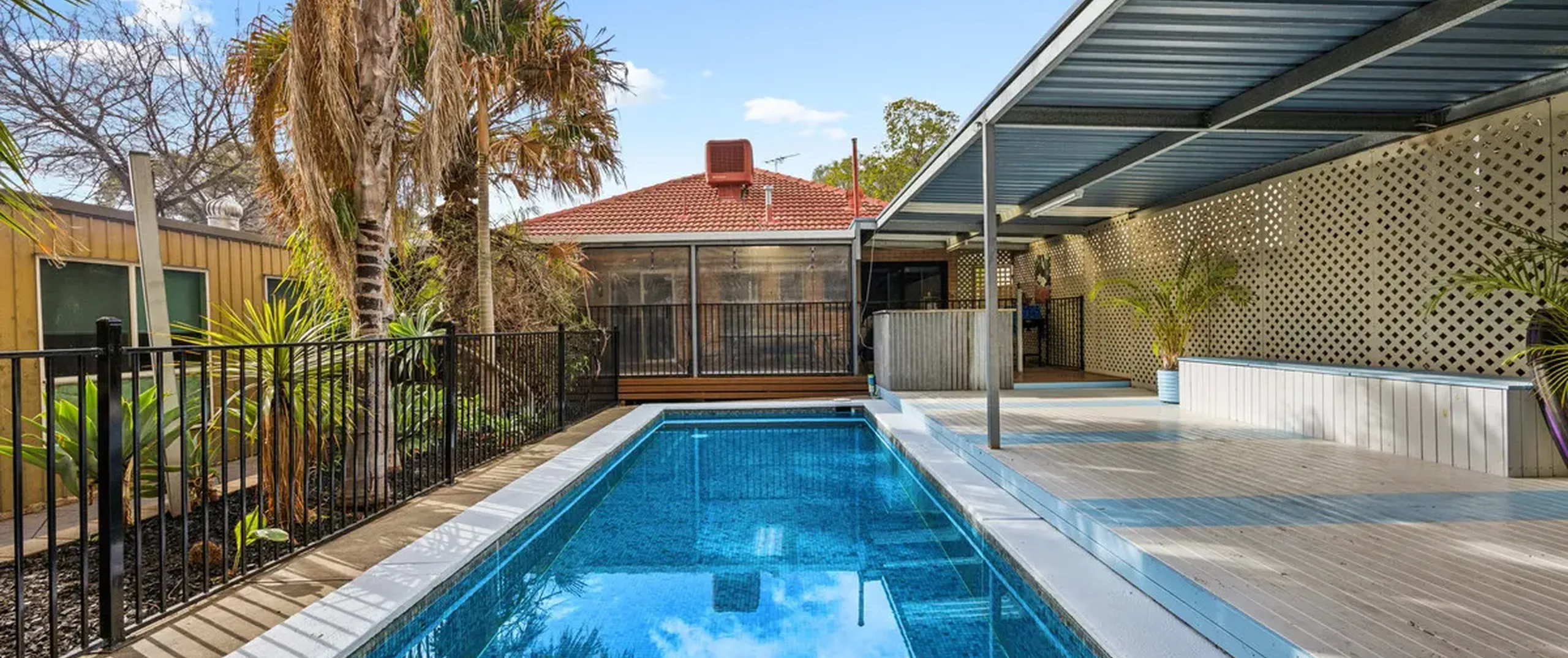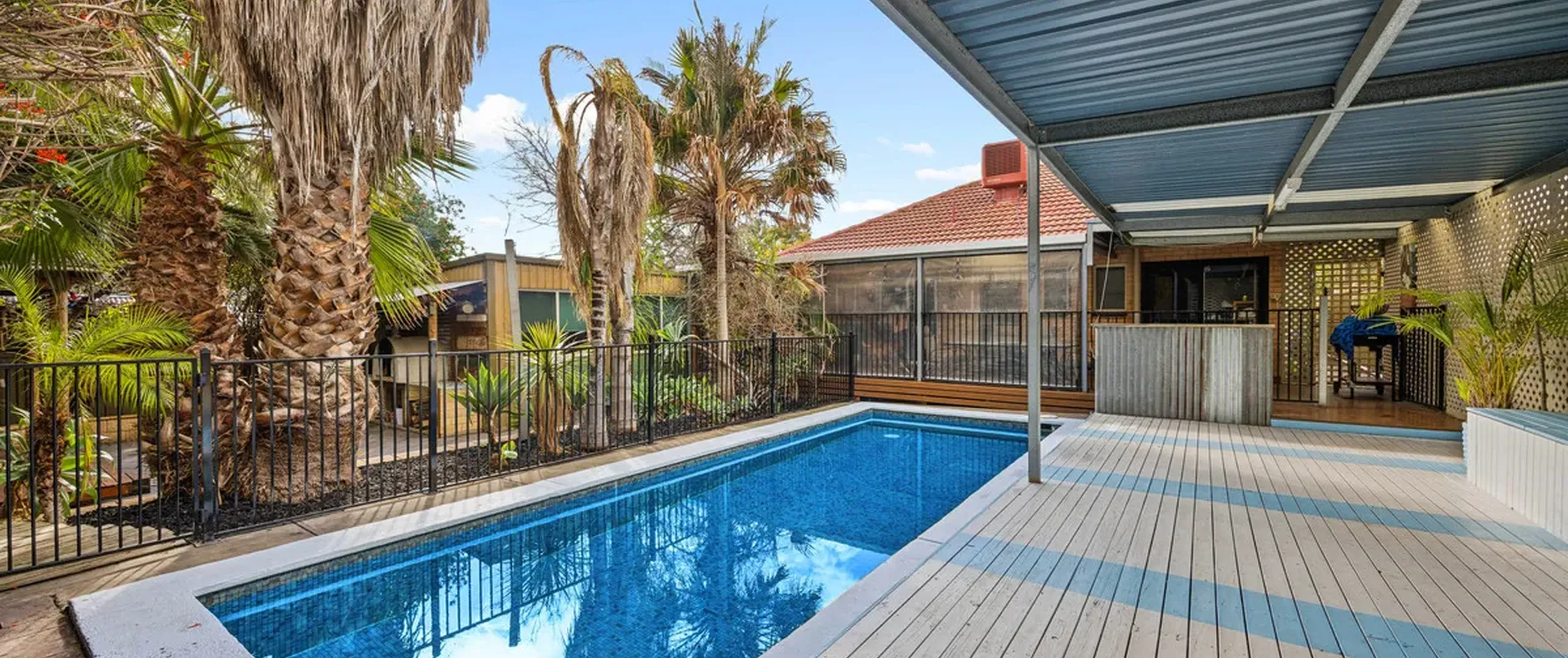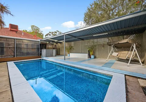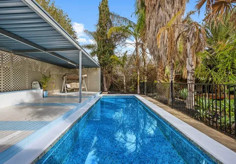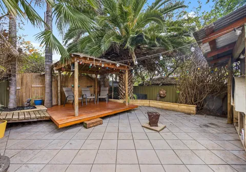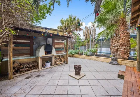 The rear deck covered verandah and wood oven invite year-round entertaining and look upon the sparkling in-ground pool with solar heating. A fully paved front yard allows ample off-street parking behind the private front fence, while the established subtropical gardens evoke peace and relaxation.