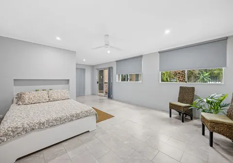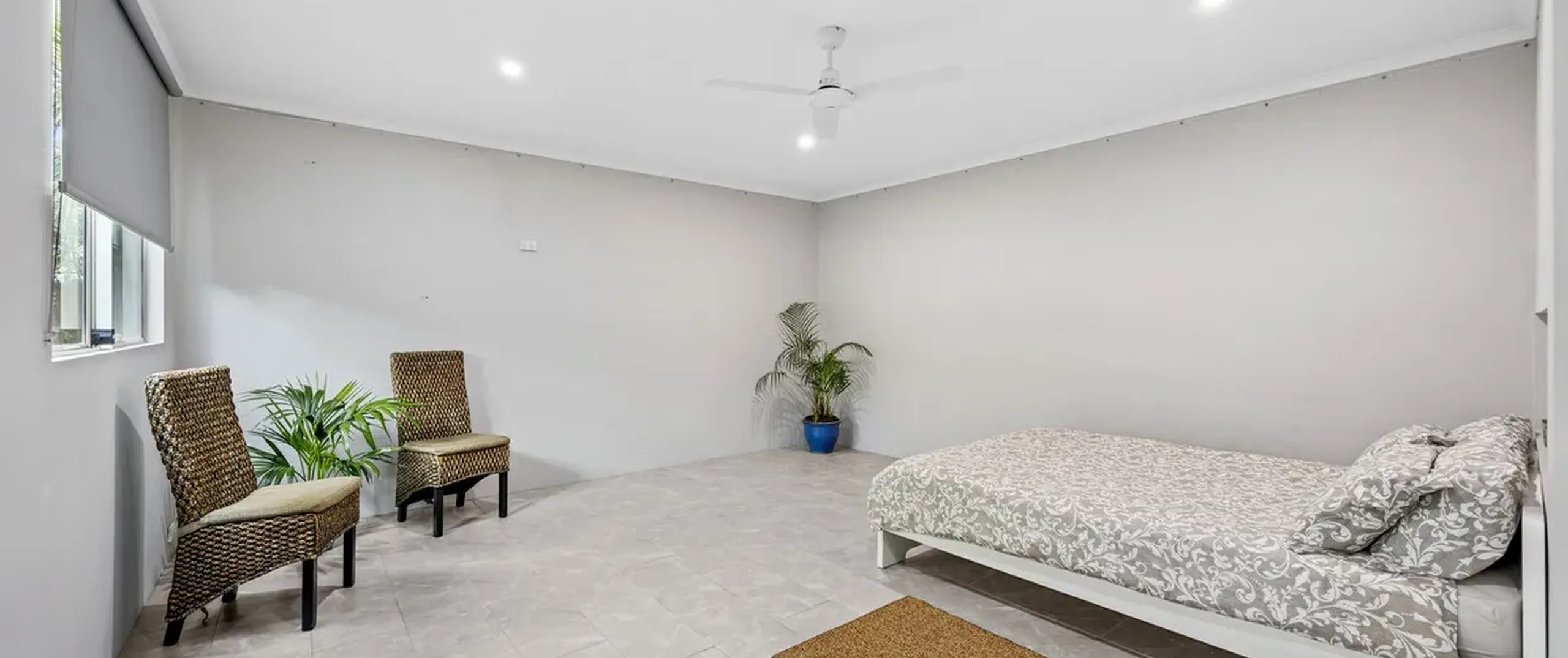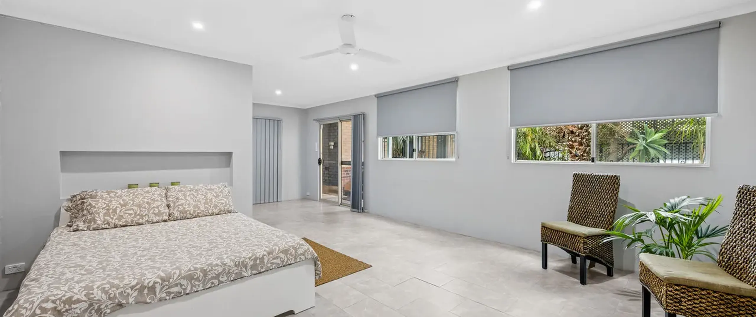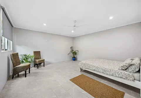 - Large rear studio with walk-in robe or storage room, ceiling fan and downlights