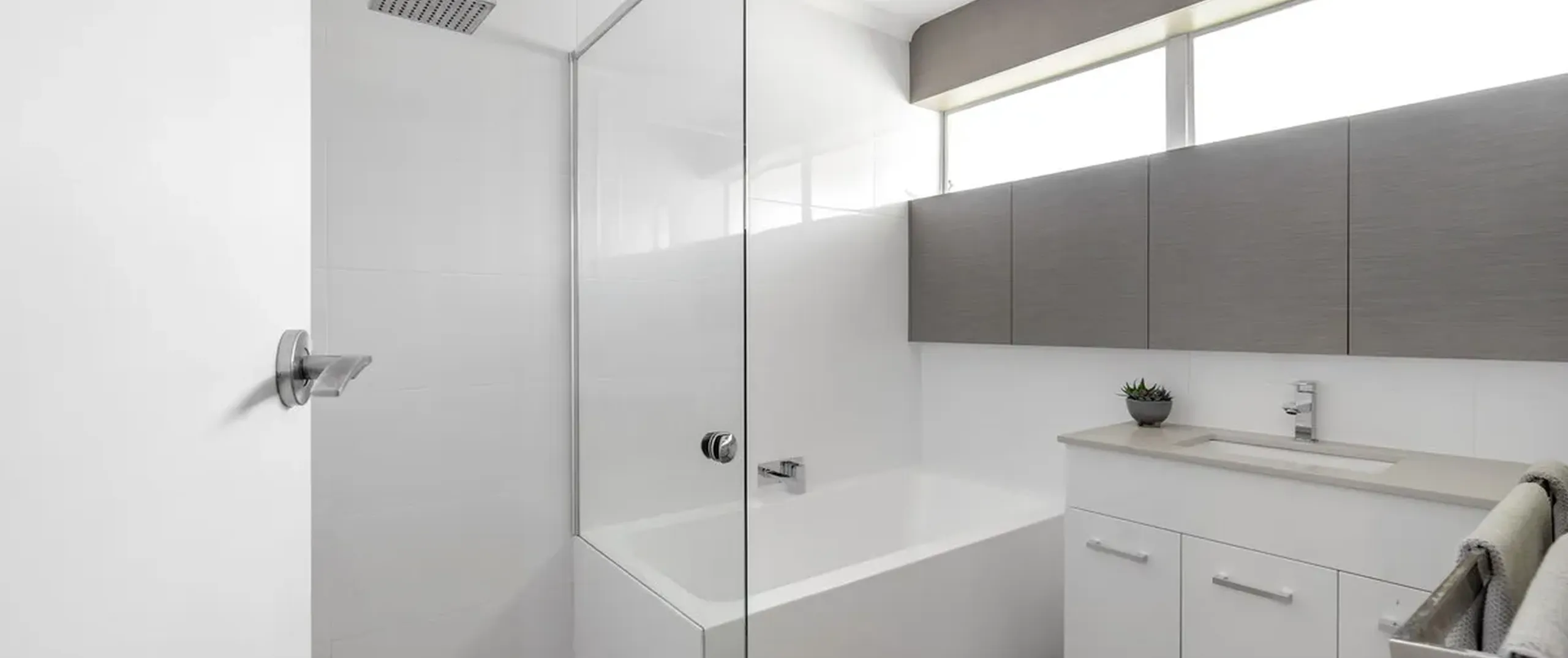 - Modern main bathroom with floor to ceiling tiles, bath, separate shower and separate toilet