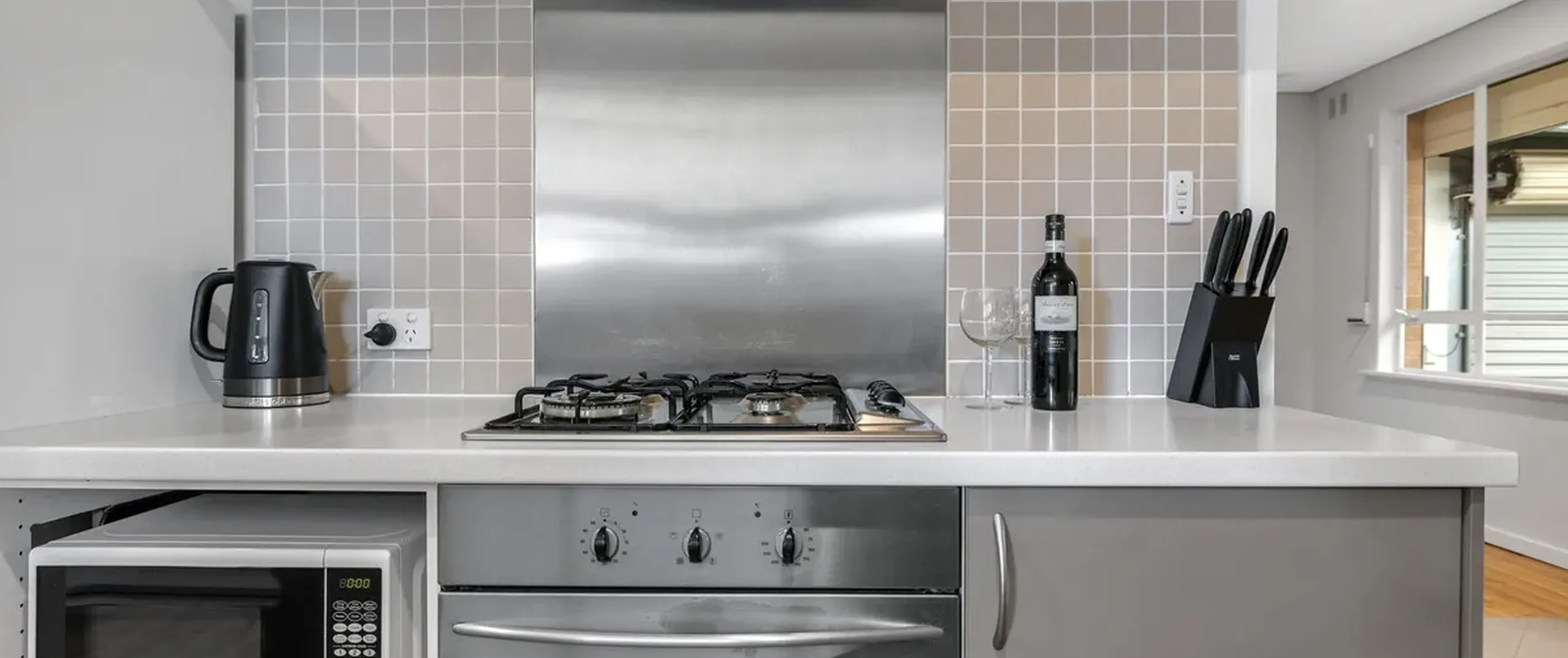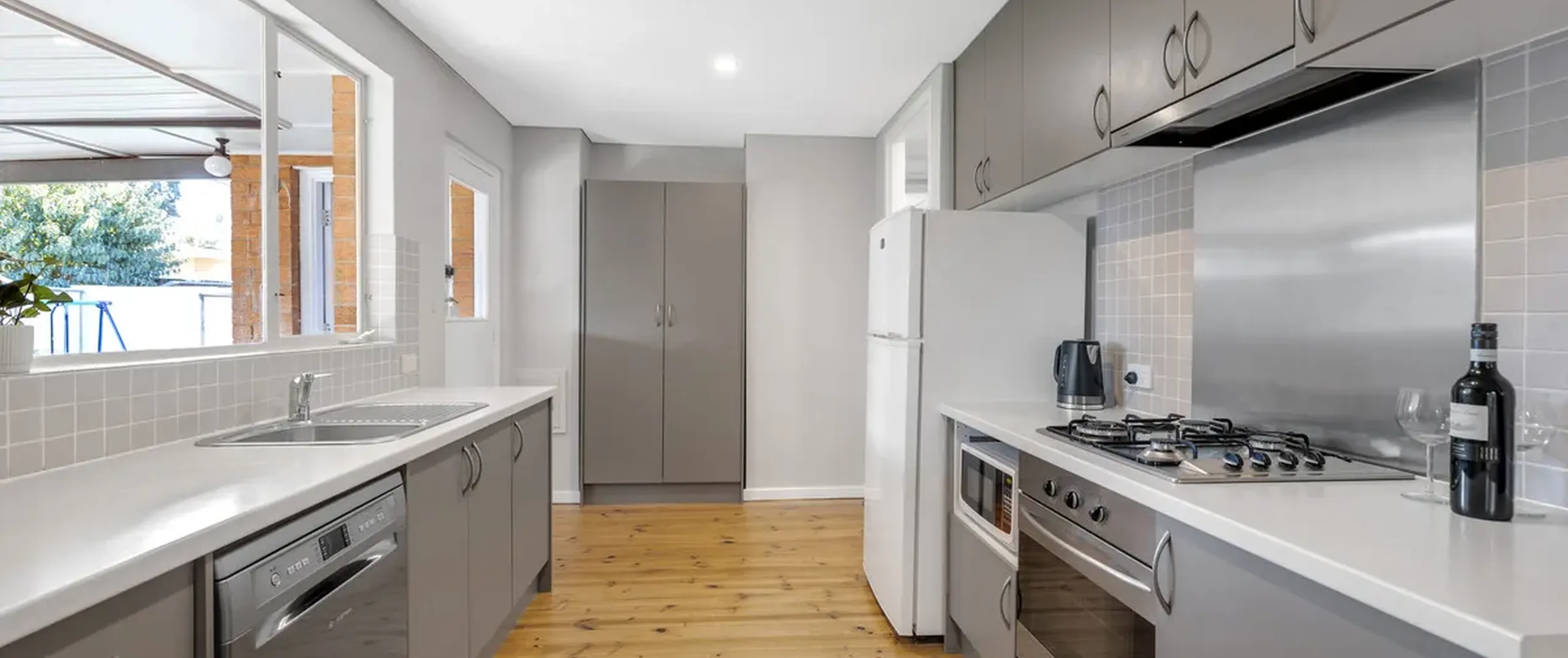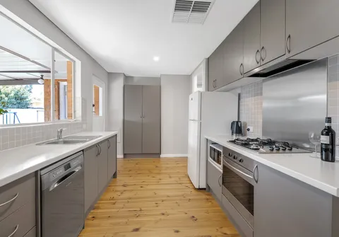 - Stylish kitchen featuring ample cupboard and bench space and stainless steel appliances including gas cooktop and dishwasher