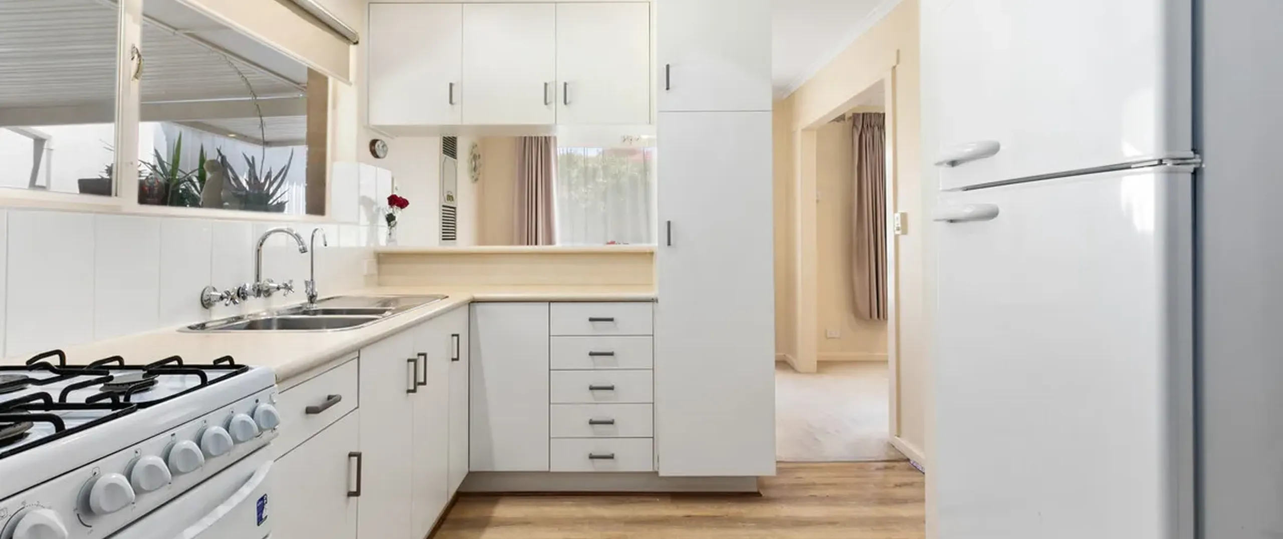 - Practical white kitchen with standalone gas cooktop and oven, ample pantry spaces and complete with servery to the dining room