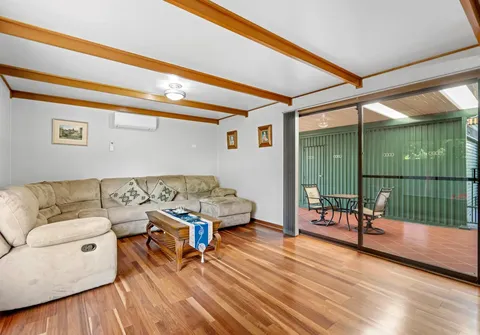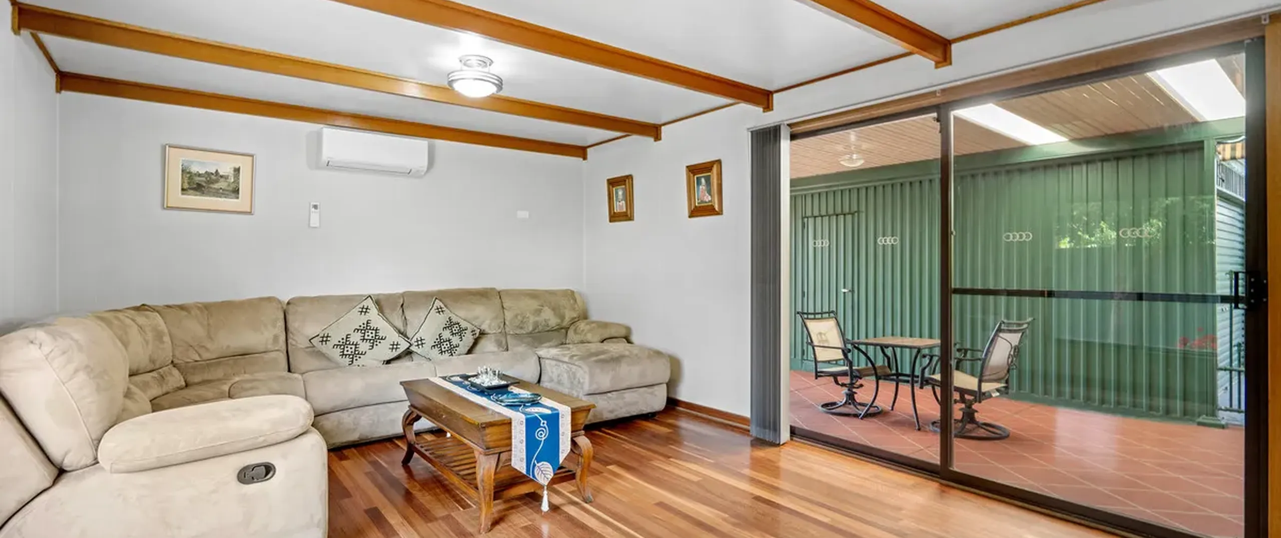 - Spacious lounge room with air conditioner and sliding door access to the pergola