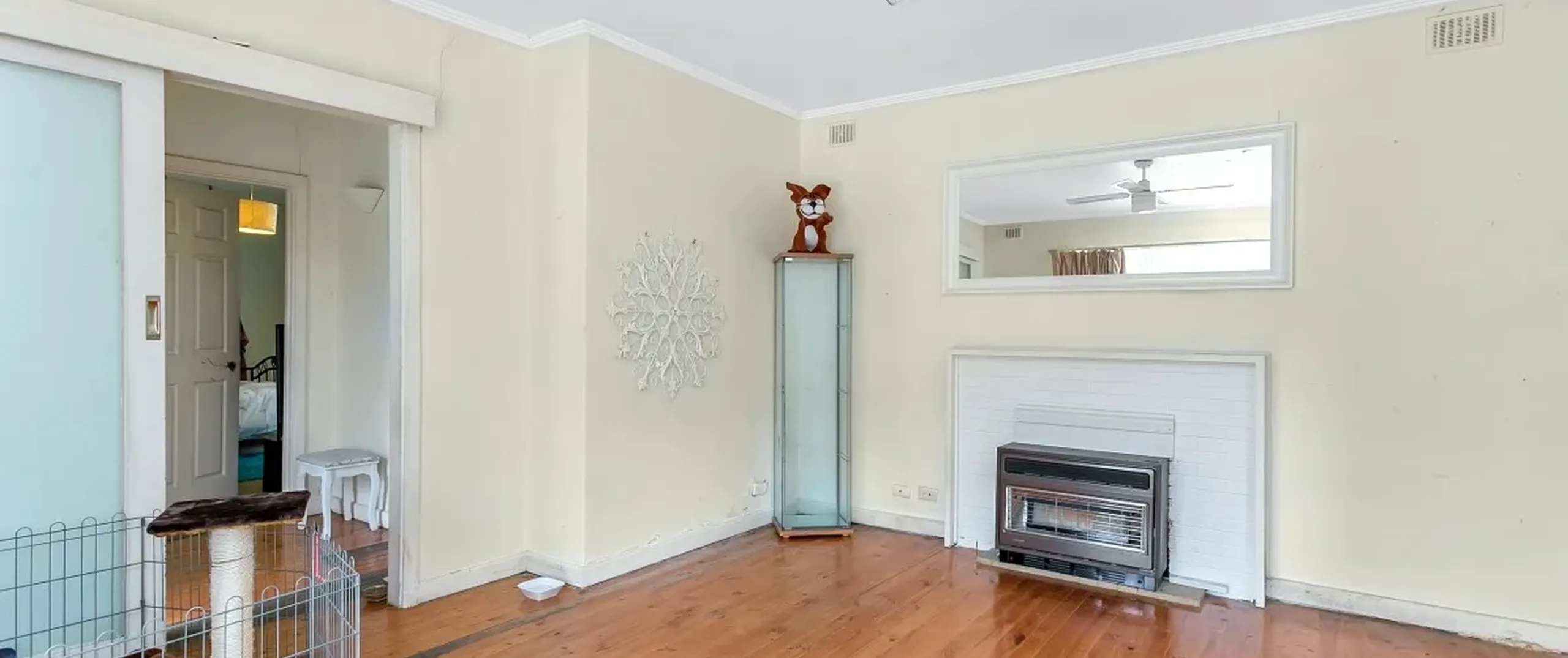 - Light filled living room with timber floorboards, ceiling fan and heater