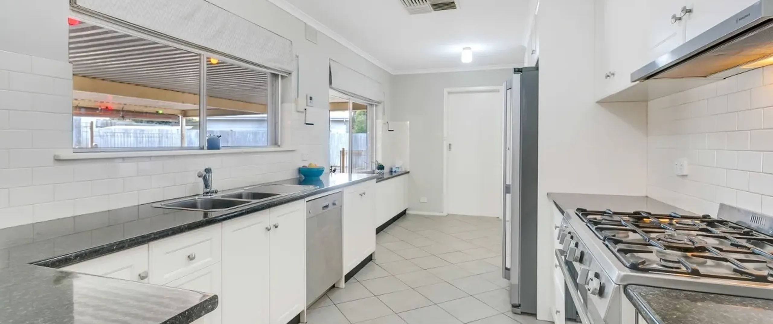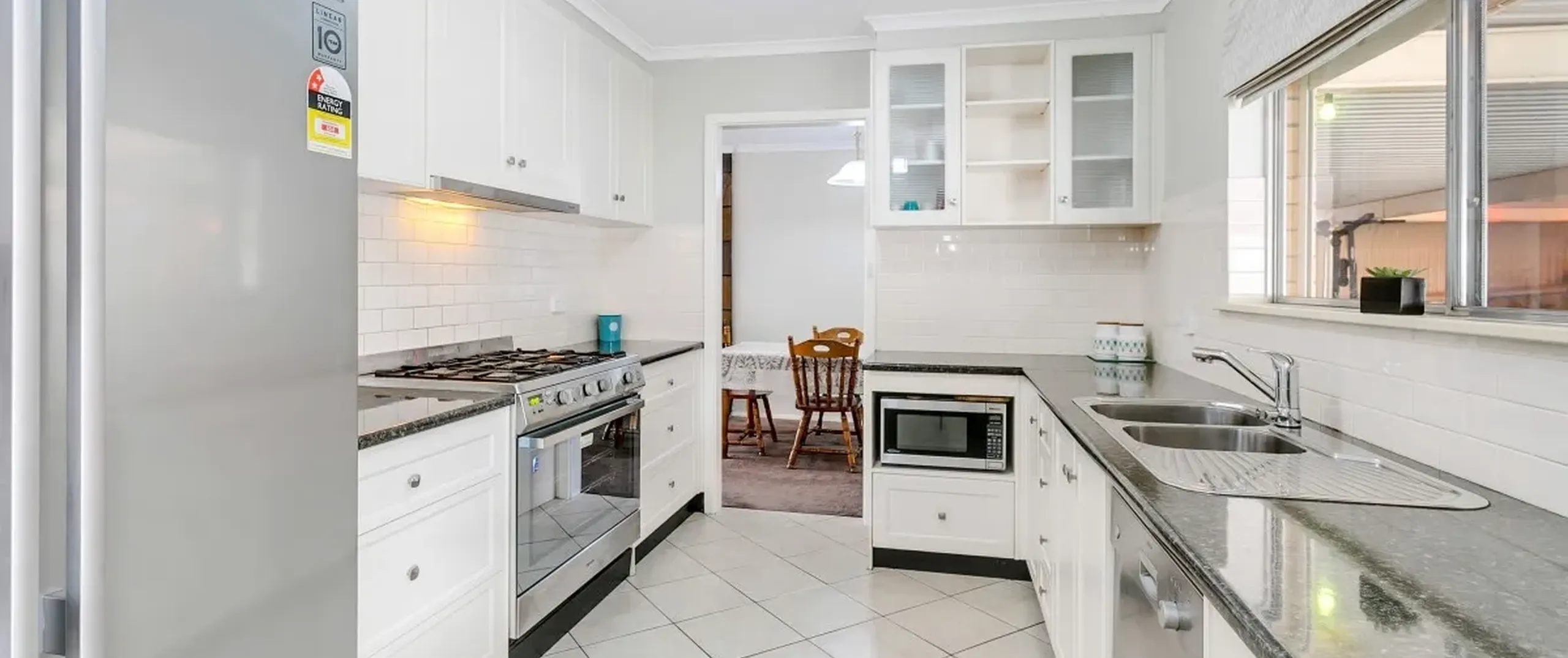 - Updated, stylish kitchen with gas cooktop, ample bench and cupboard space and eat-in meals area