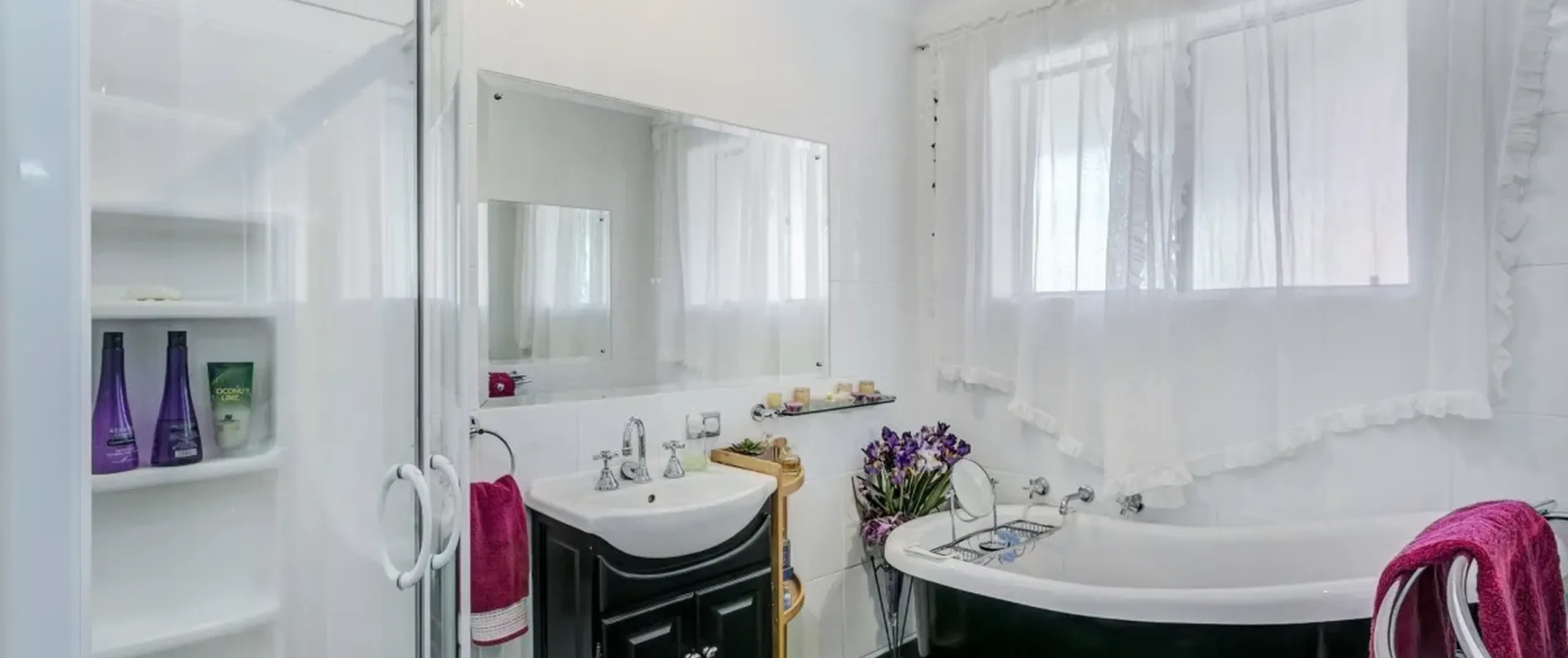 - Neat and tidy bathroom with freestanding bath and shower + separate toilet