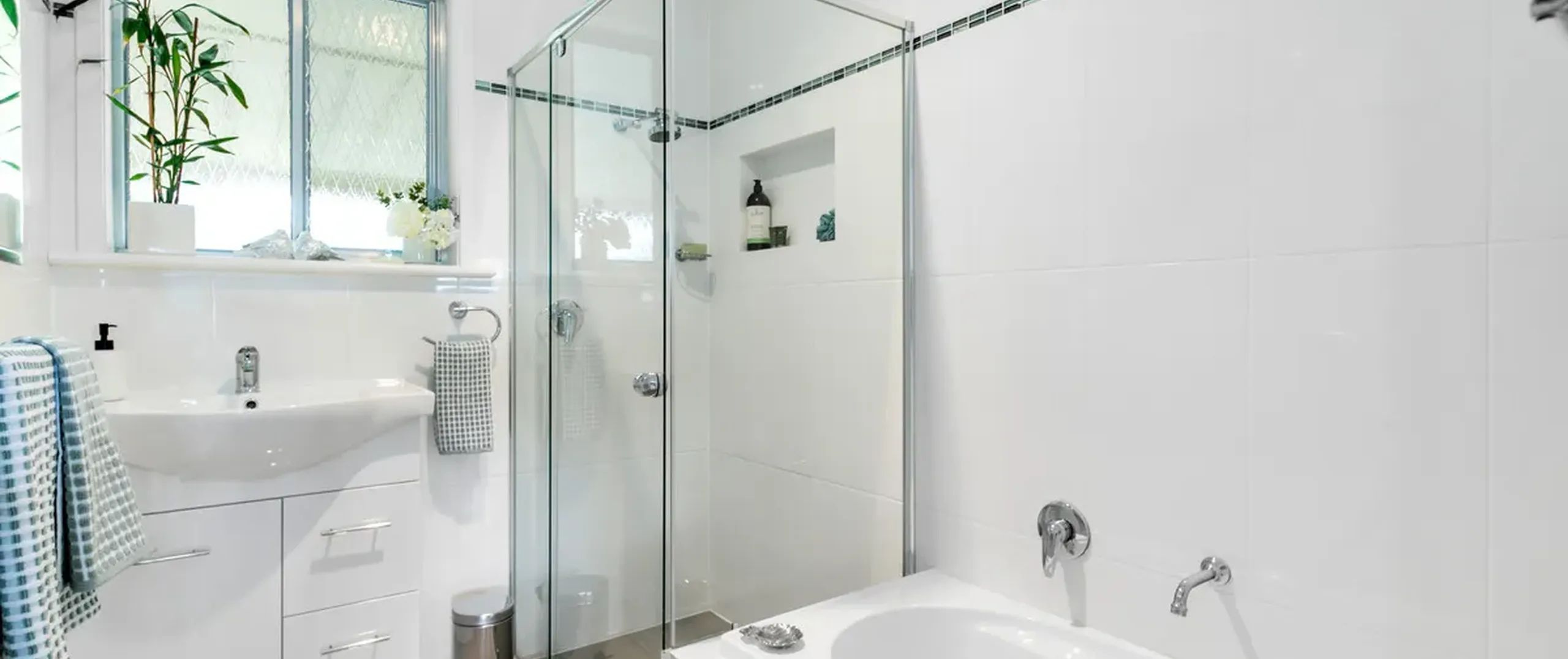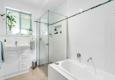 - Stylish bathroom with floor to ceiling tiles, shower niche and separate bath with convenient separate toilet