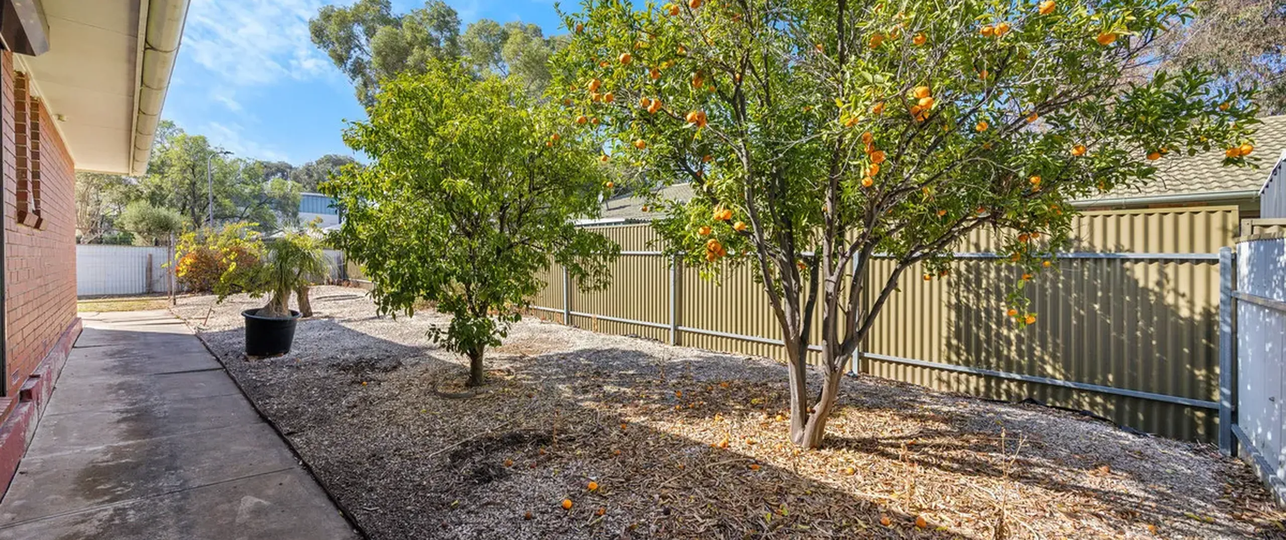 - Spacious rear yard with established fruit trees