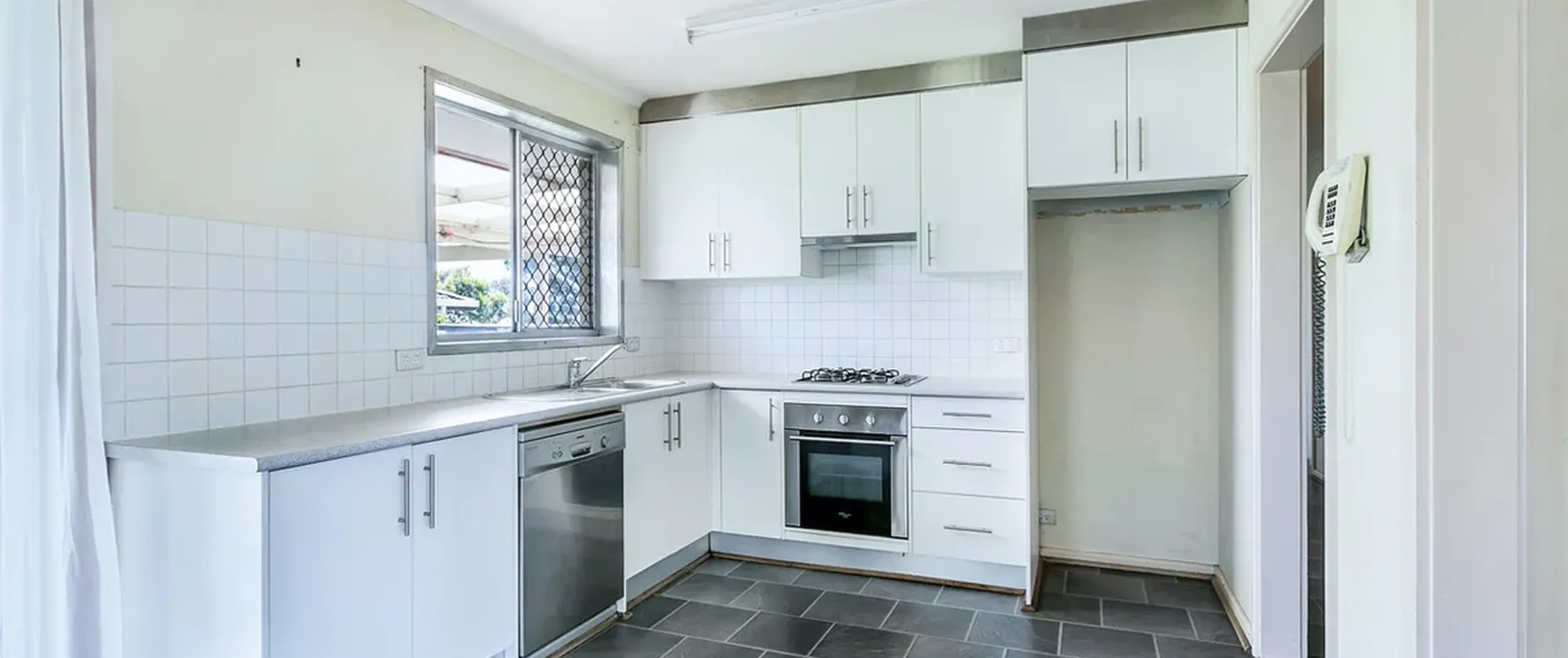 - Bright kitchen with plenty of cupboard space, gas hotplate