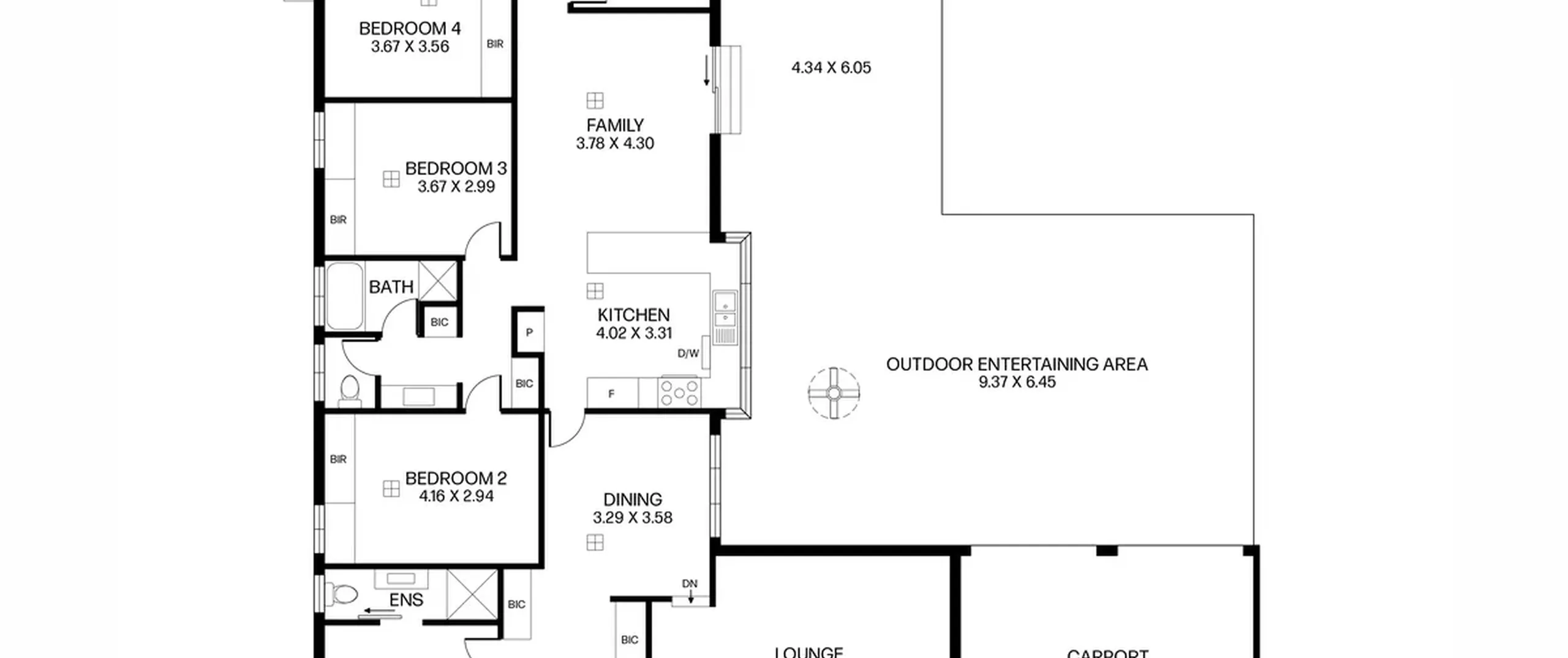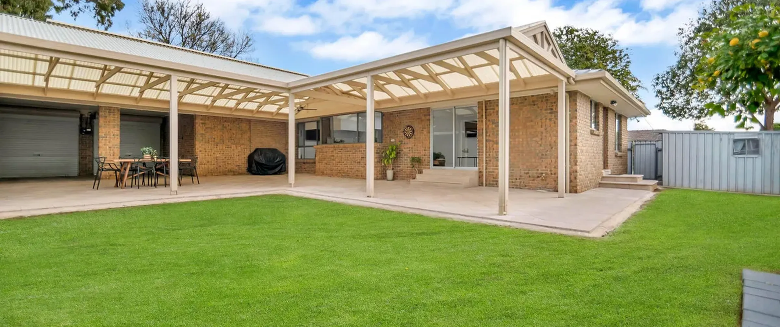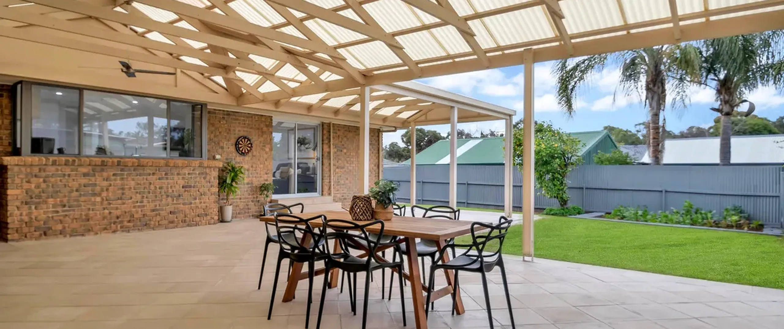 - Massive outdoor entertaining area with ceiling fan and pitched roof