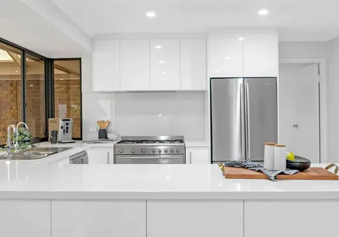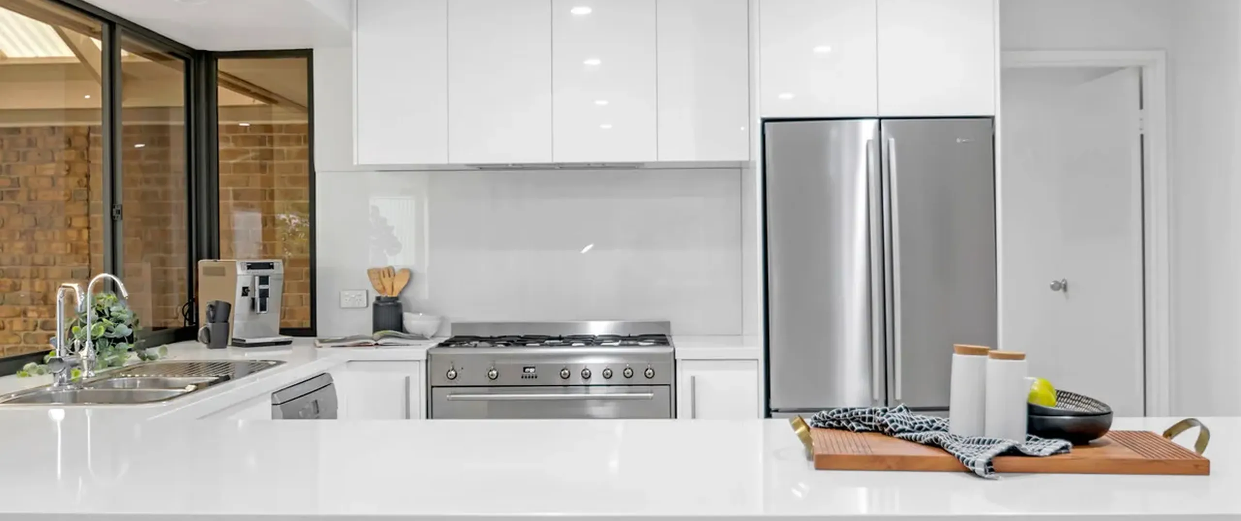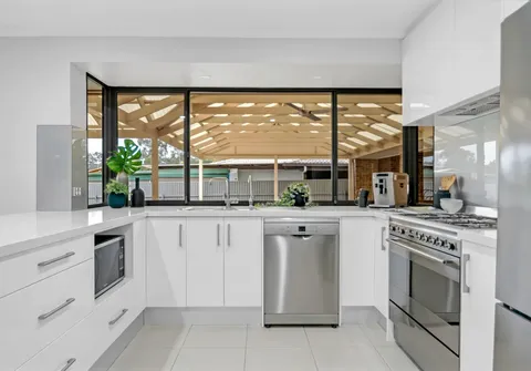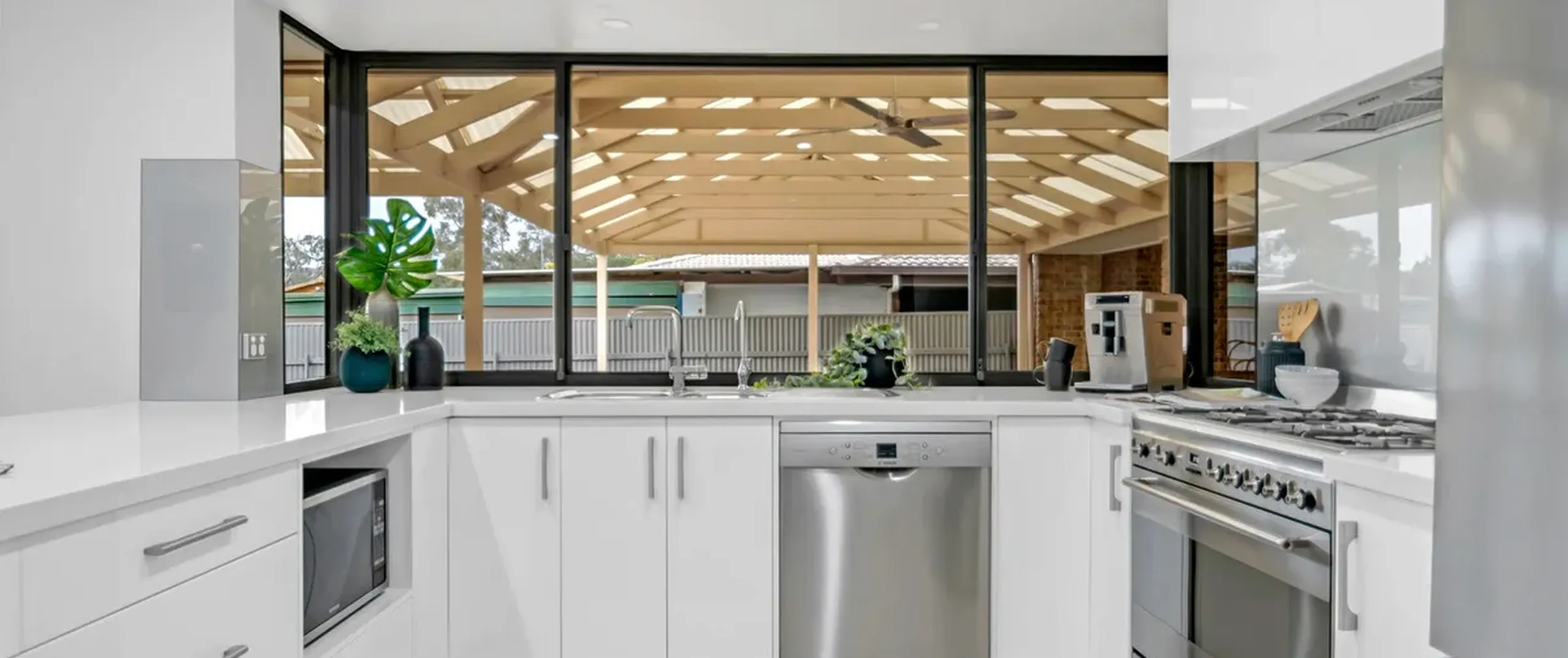 - Modern kitchen with Caesar stone benchtops, ample cupboard and bench space, SMEG stainless steel appliances and window overlooking outdoor entertaining area
