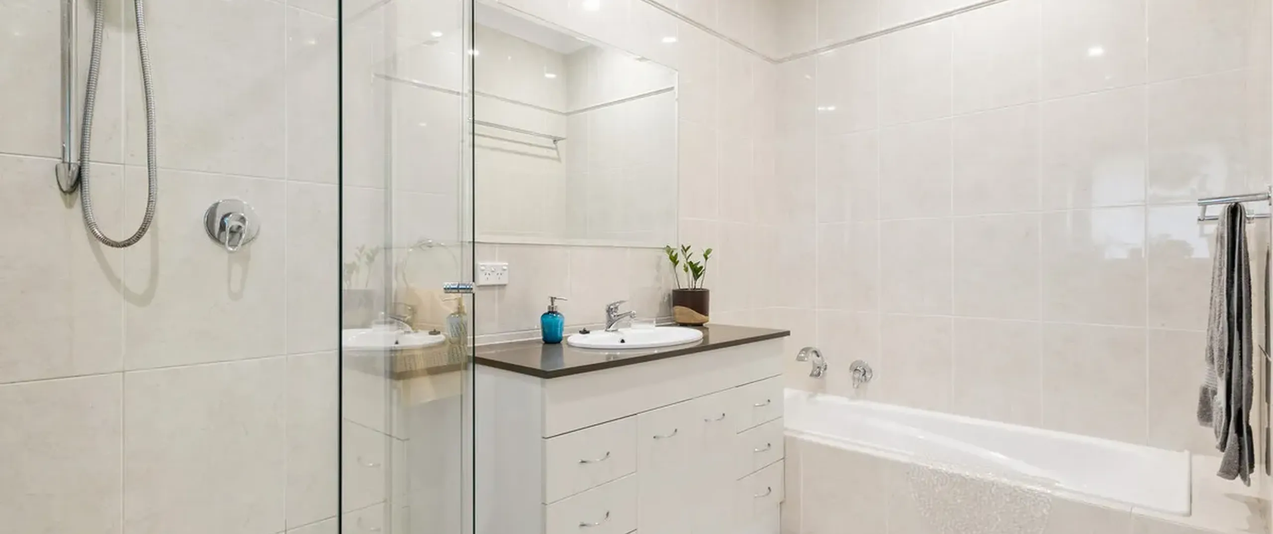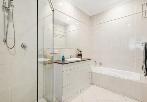 - Modern bathroom with floor to ceiling tiles, bath and separate shower