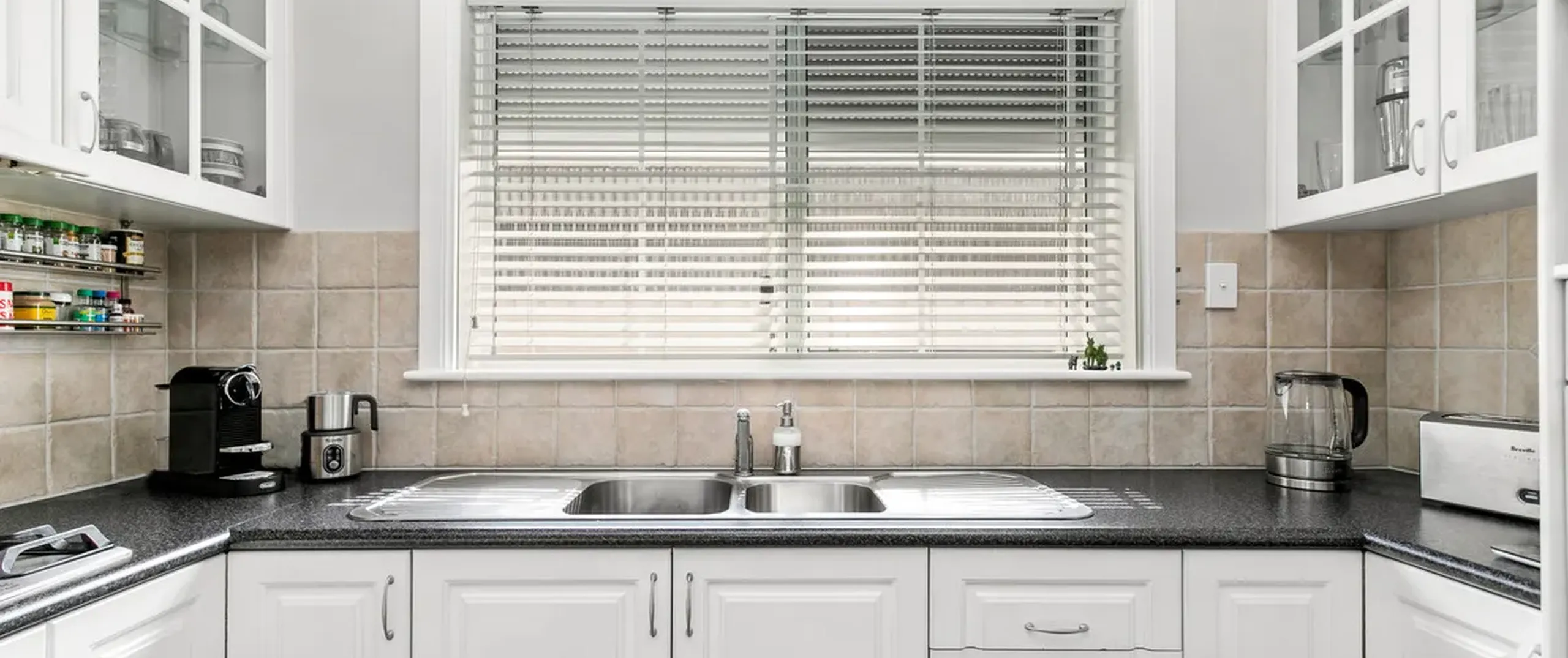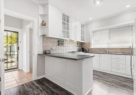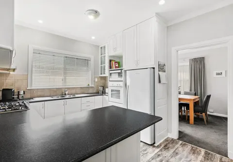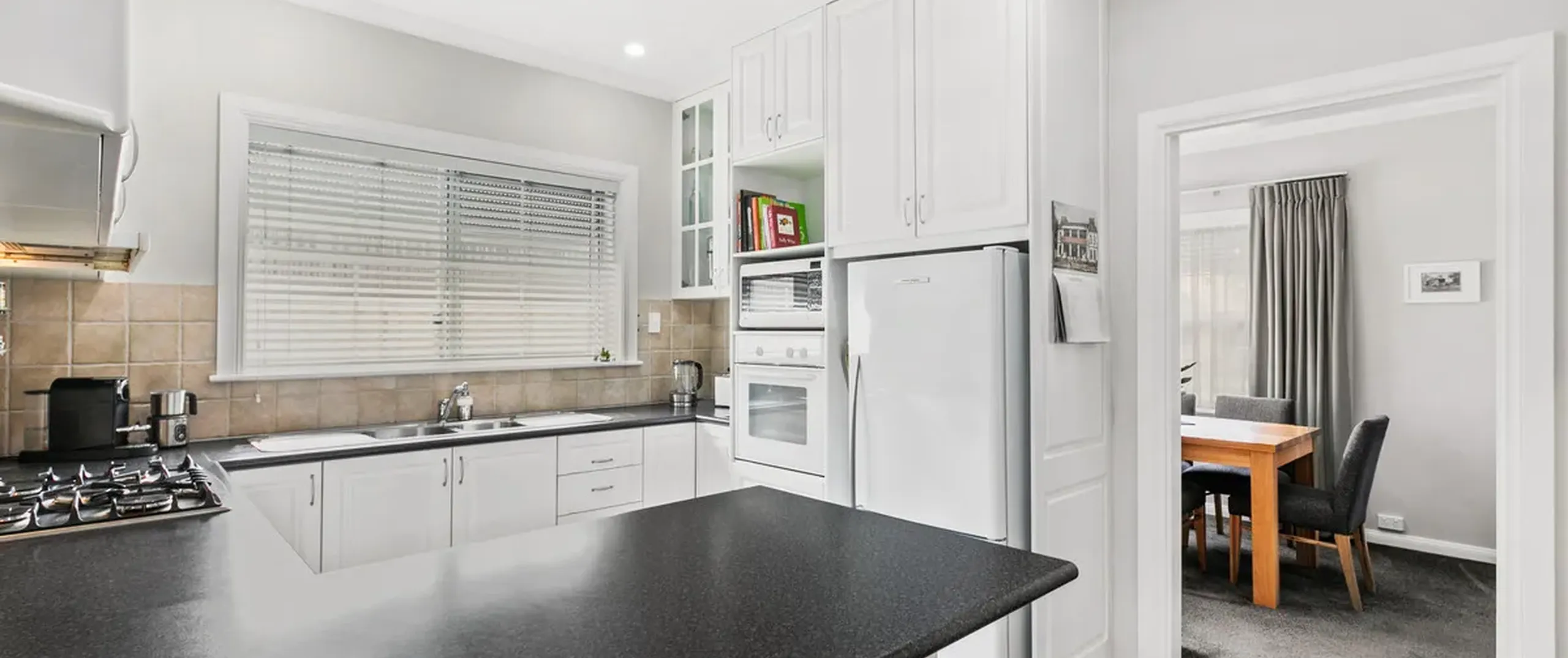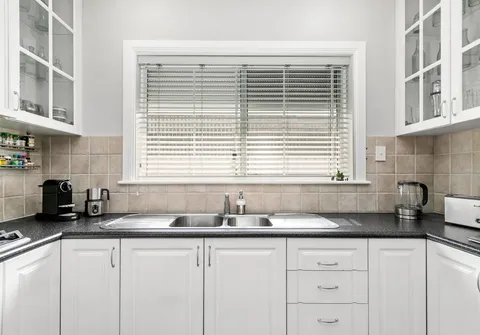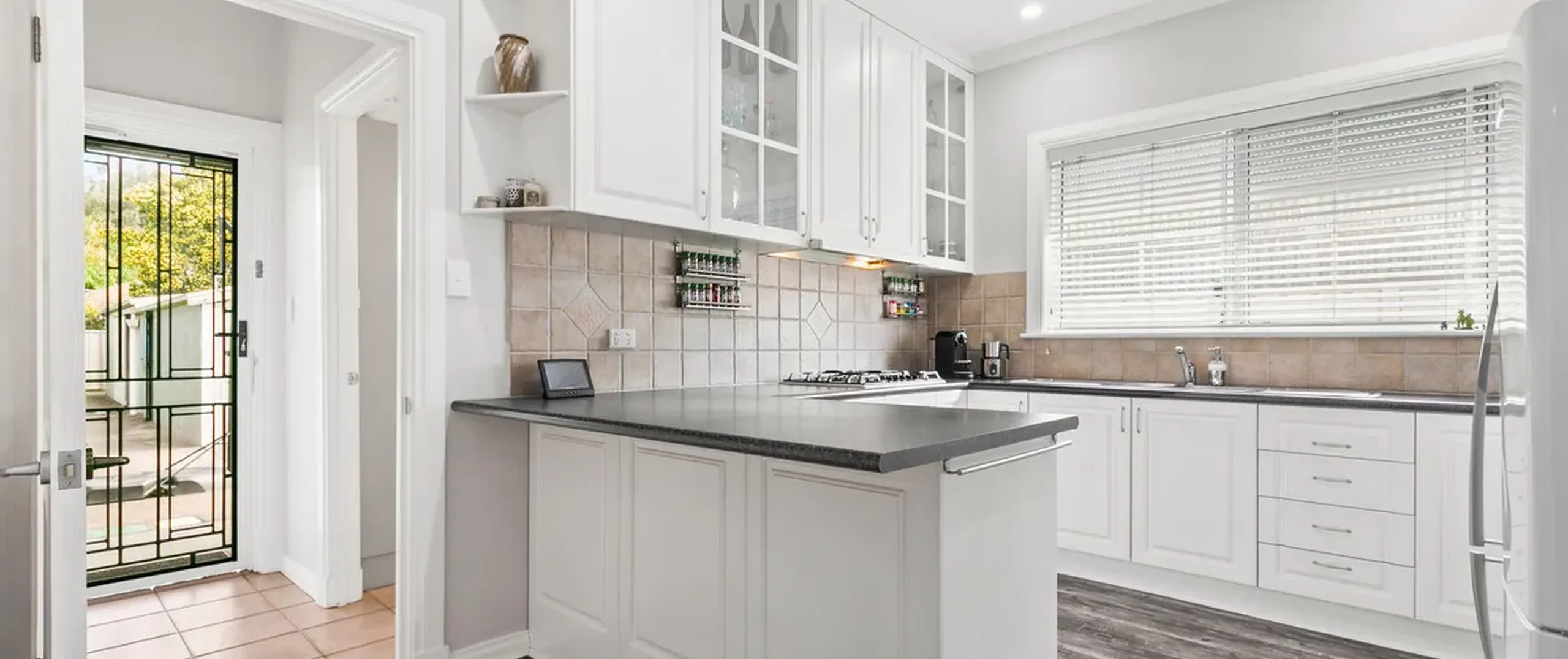 - Chic white kitchen with gas cooktop, ample cupboard space and sweeping bench top with breakfast bar