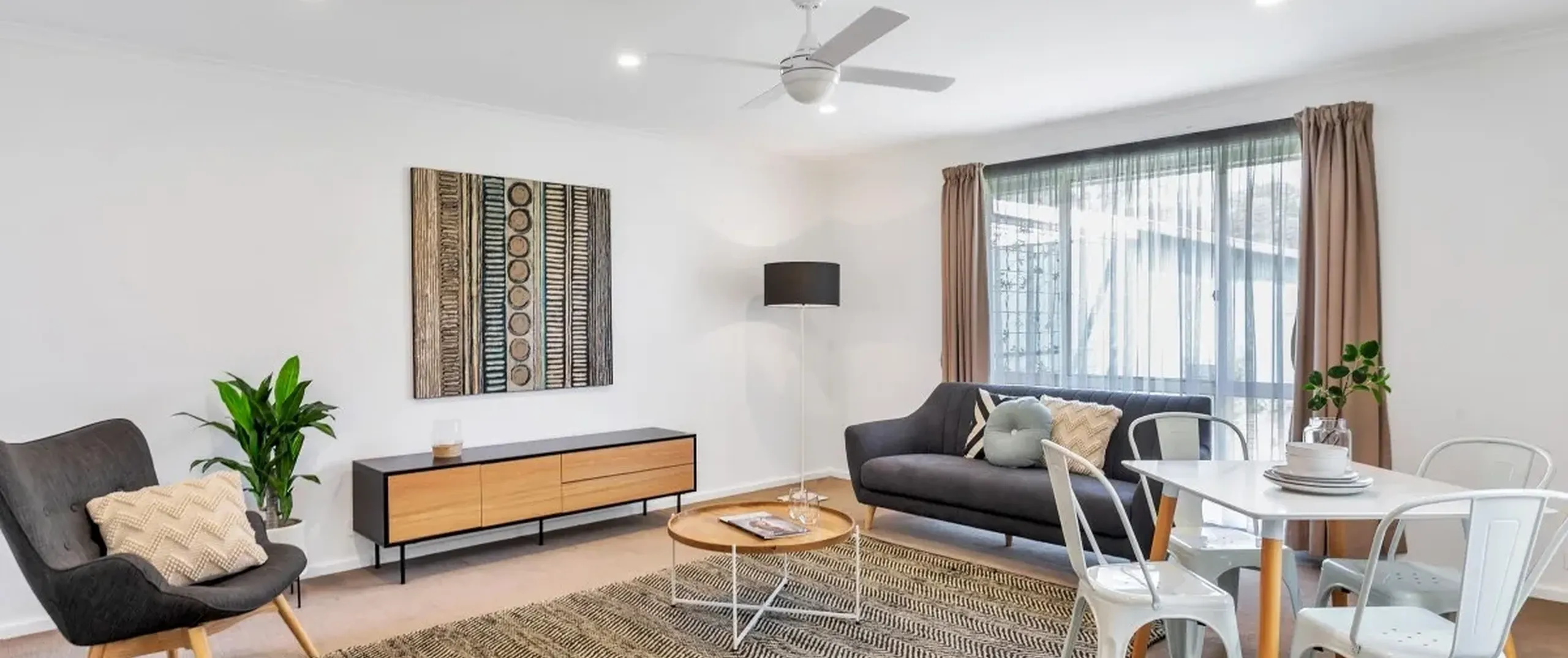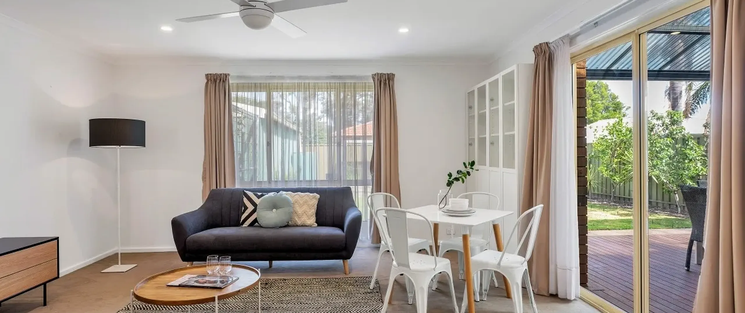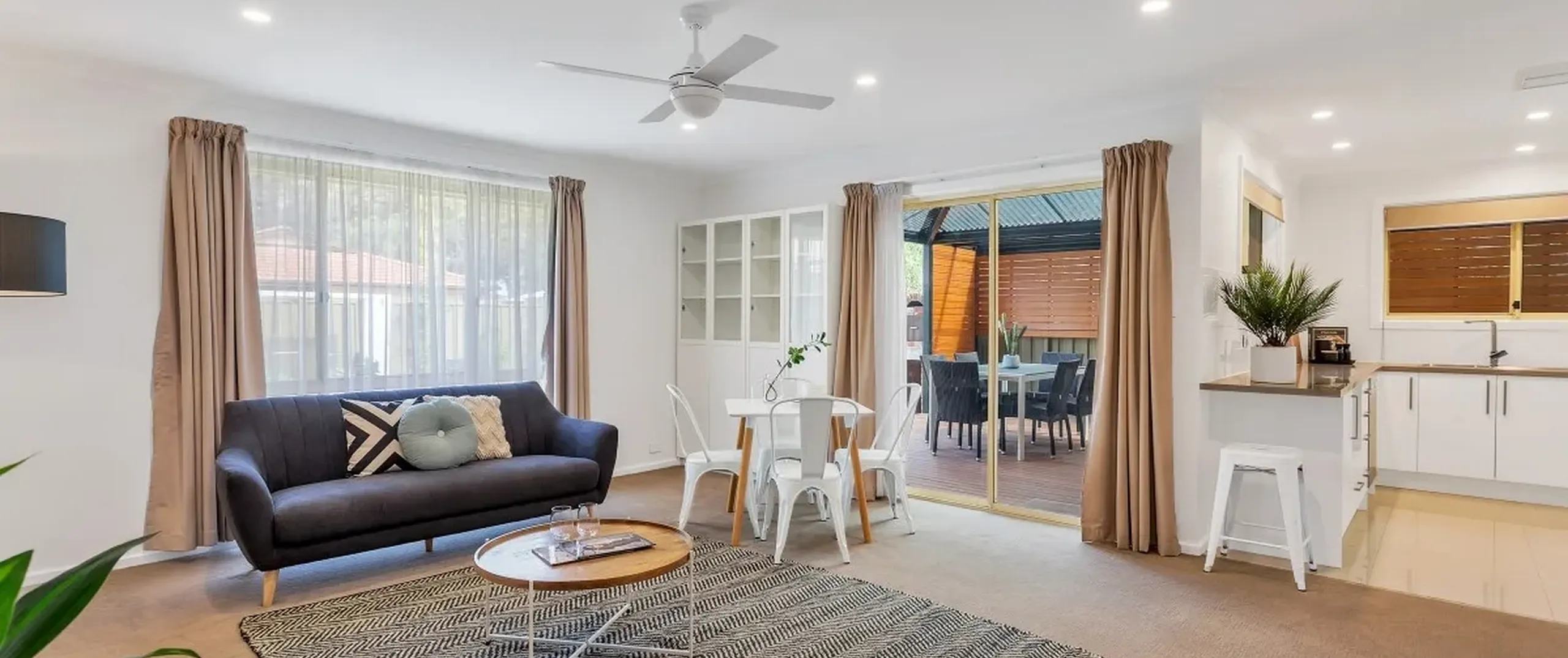 - On trend living area with ceiling fan and natural flow to the outdoor entertaining area