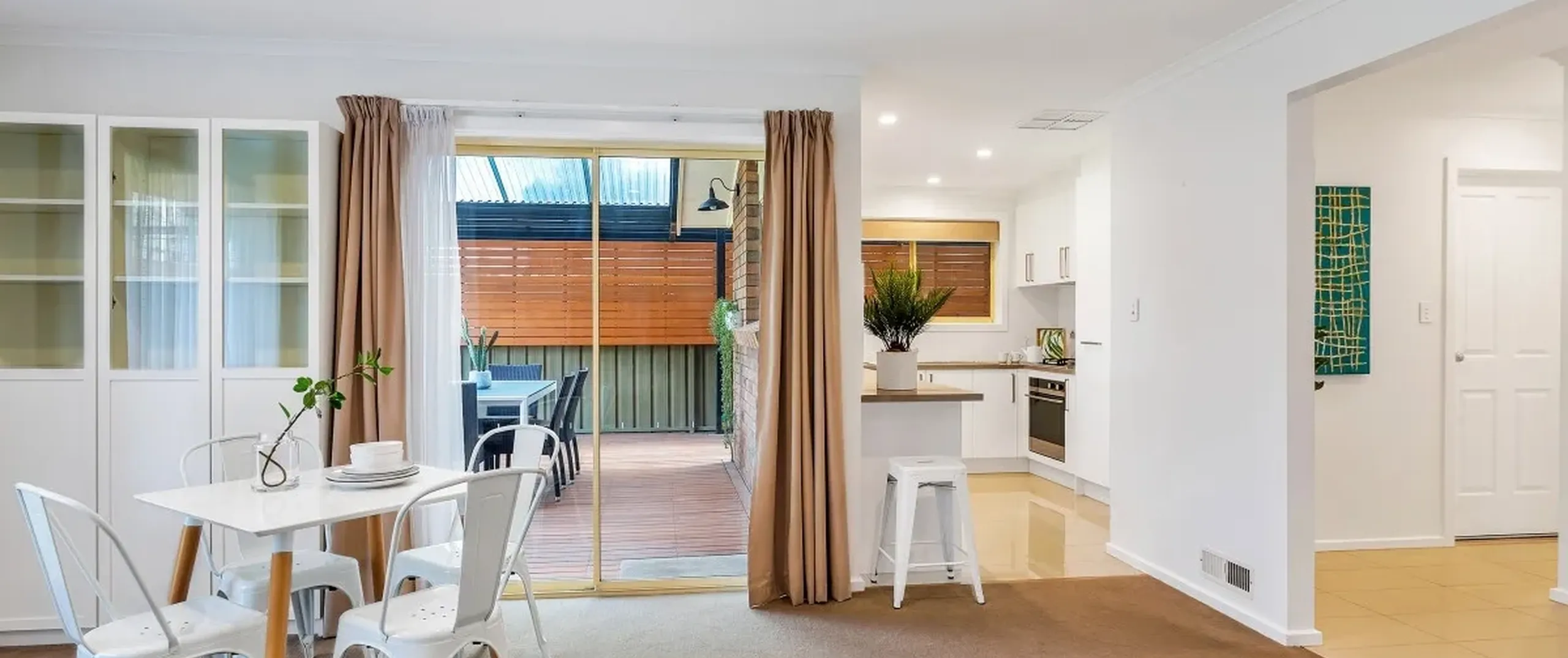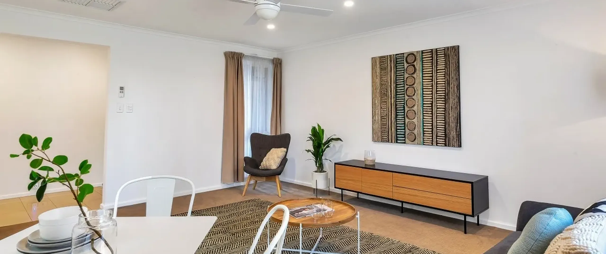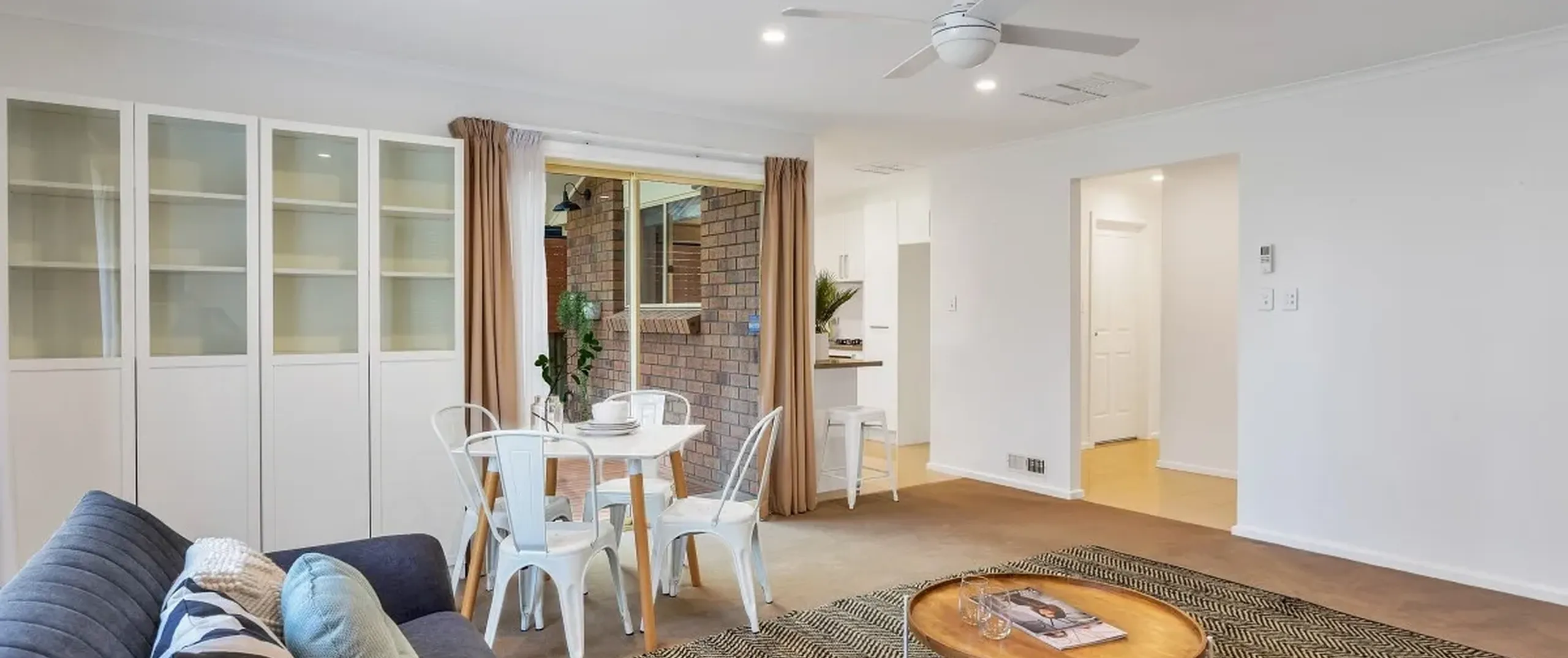 - On trend living area with ceiling fan and natural flow to the outdoor entertaining area