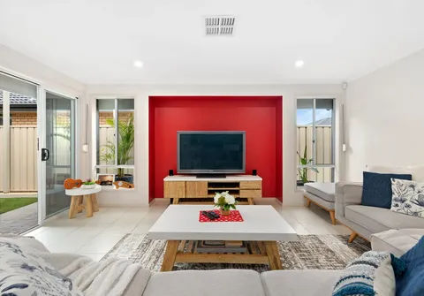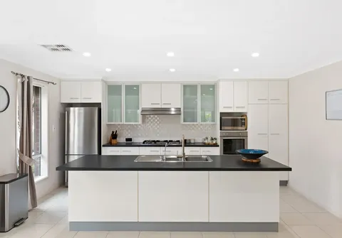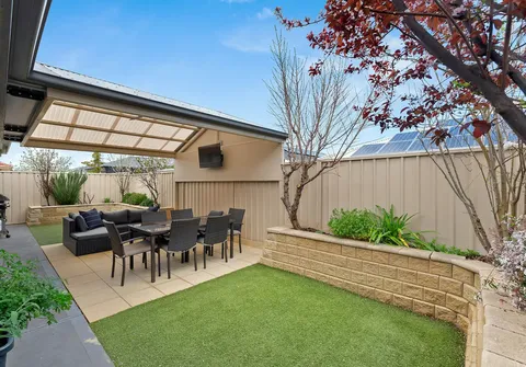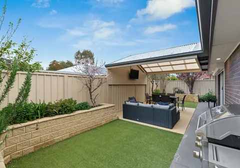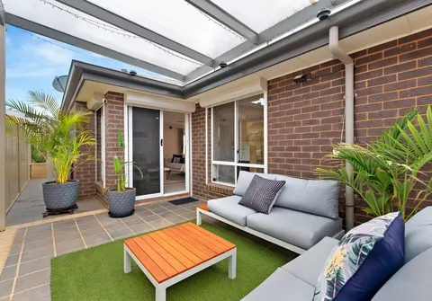 A light-filled lounge room is set at the front of the home while at the rear, you will find an open-plan kitchen, living and dining zone. The eager cook will adore the sleek kitchen with a large island or you can step outside to the patio and admire the landscaped yard with easy-care gardens and artificial turf.