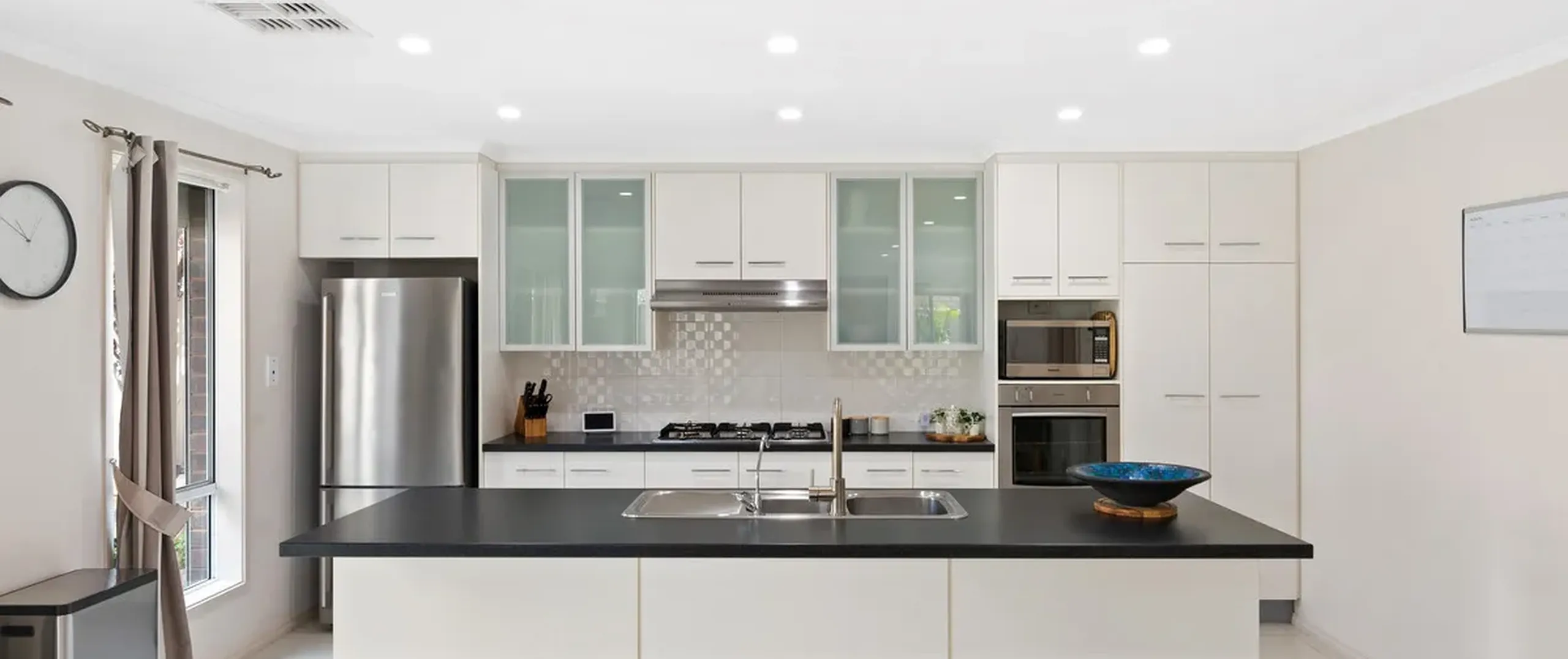 - Stylish kitchen featuring breakfast bar, ample cupboard and bench space and quality stainless steel appliances