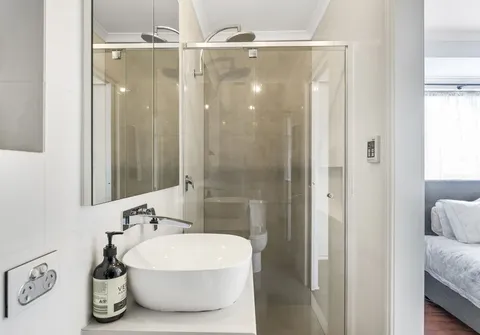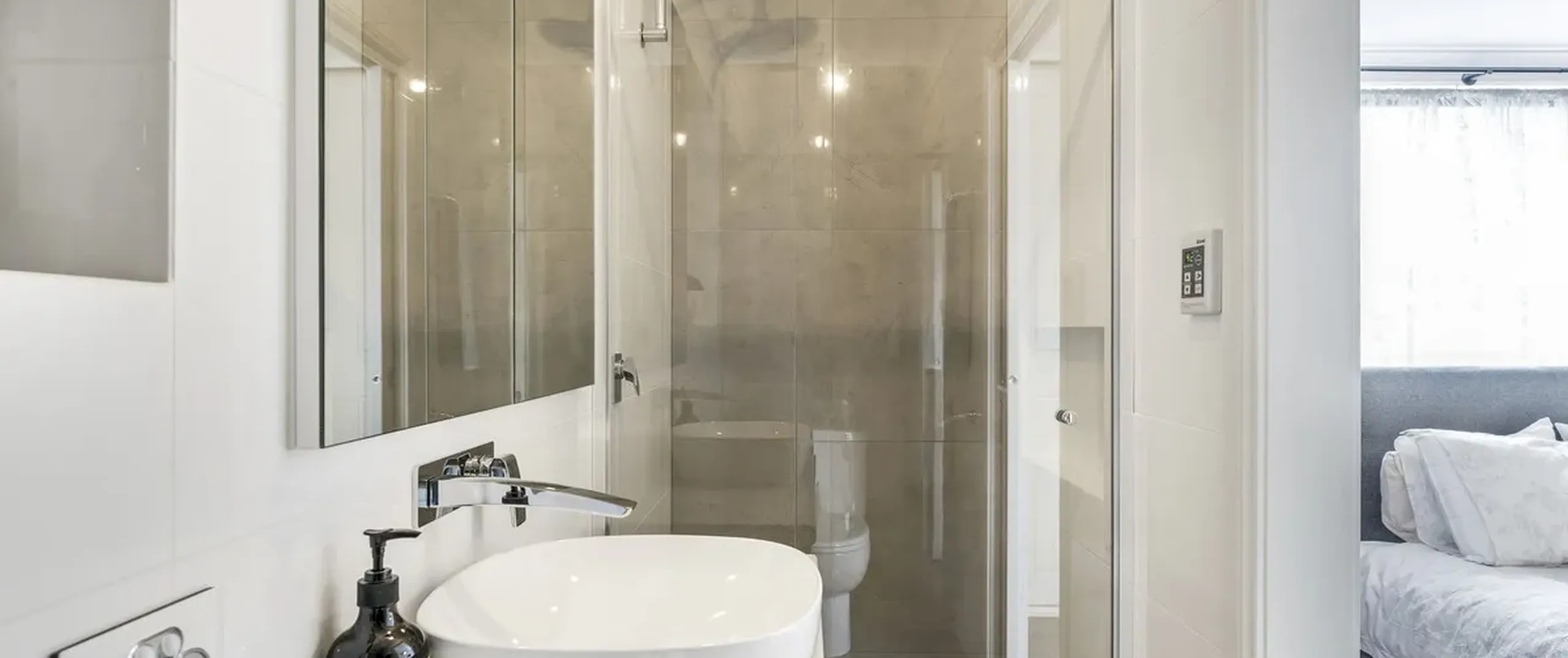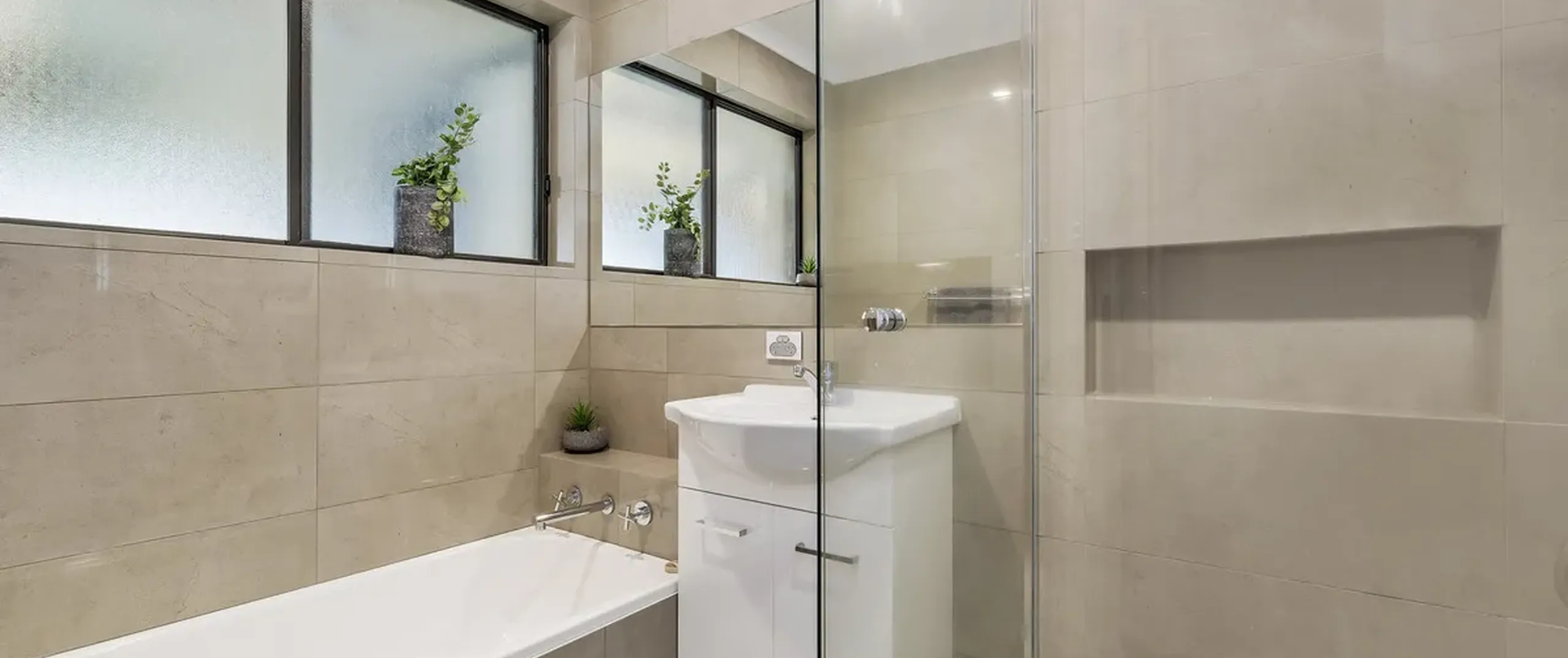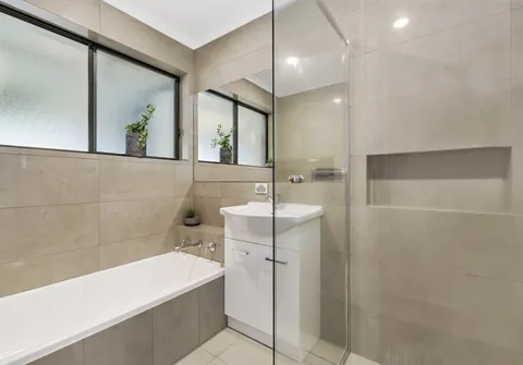 - Contemporary main bathroom complete with floor to ceiling tiles, frameless shower screen and tiled niche in shower