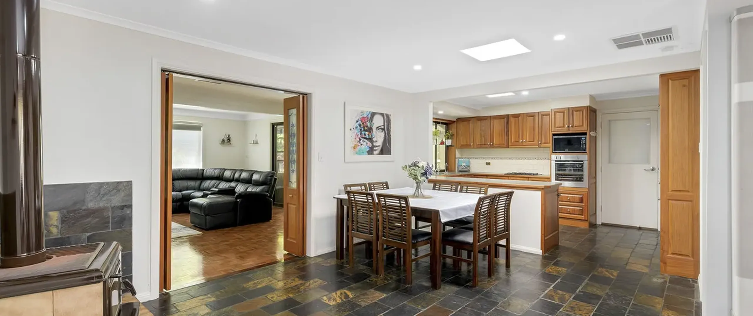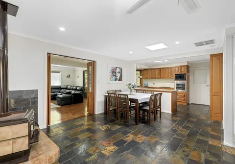 - Meals area adjacent kitchen with combustion fire for cozy ambience during the cooler months as you enjoy a meal