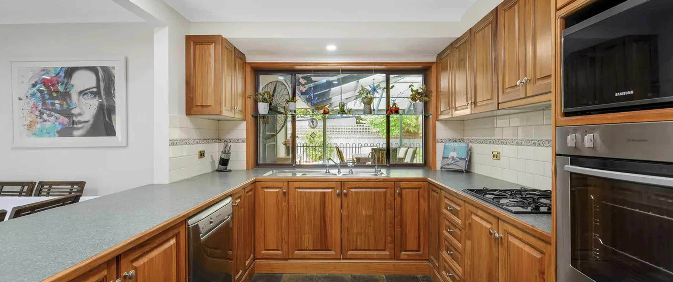 - Timber kitchen with stainless steel appliances including gas cooktop, ample cupboard space and bench space including a breakfast bar