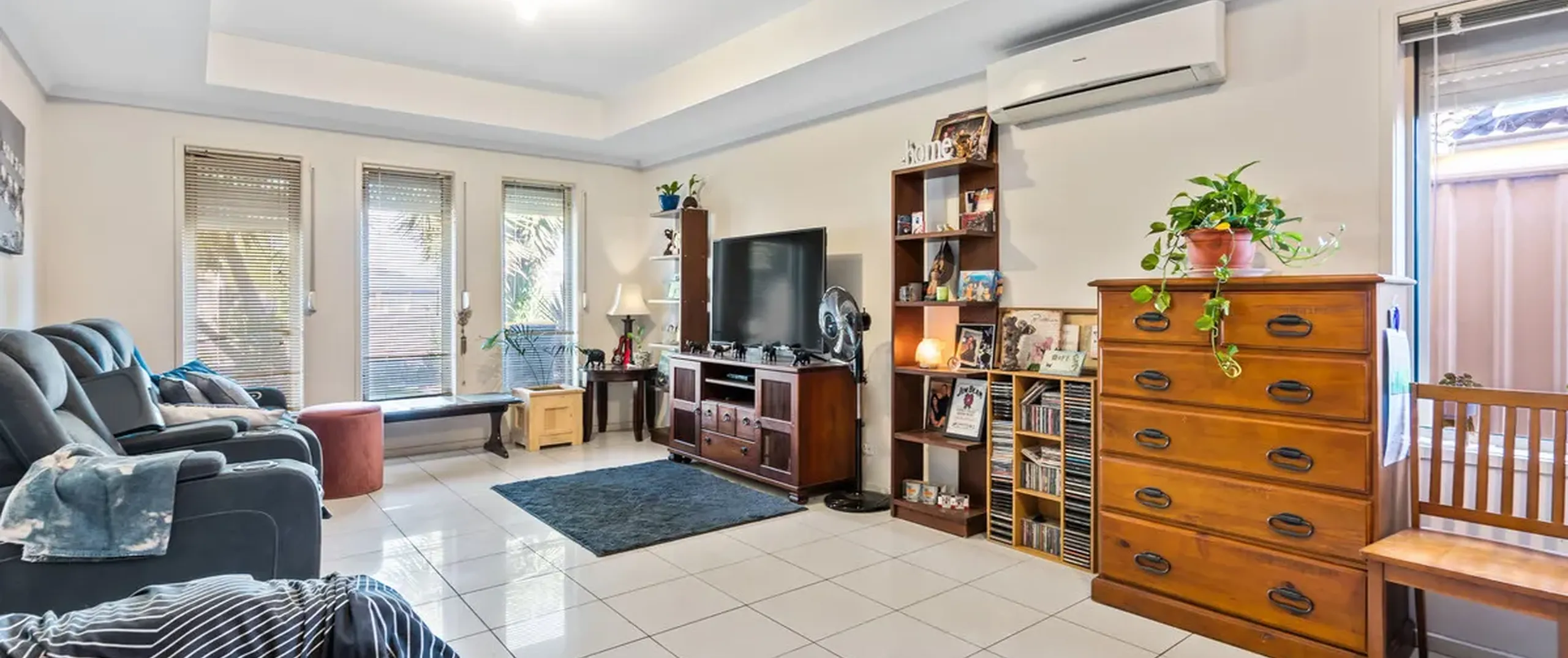 - Light filled, tiled formal lounge with split system air conditioner