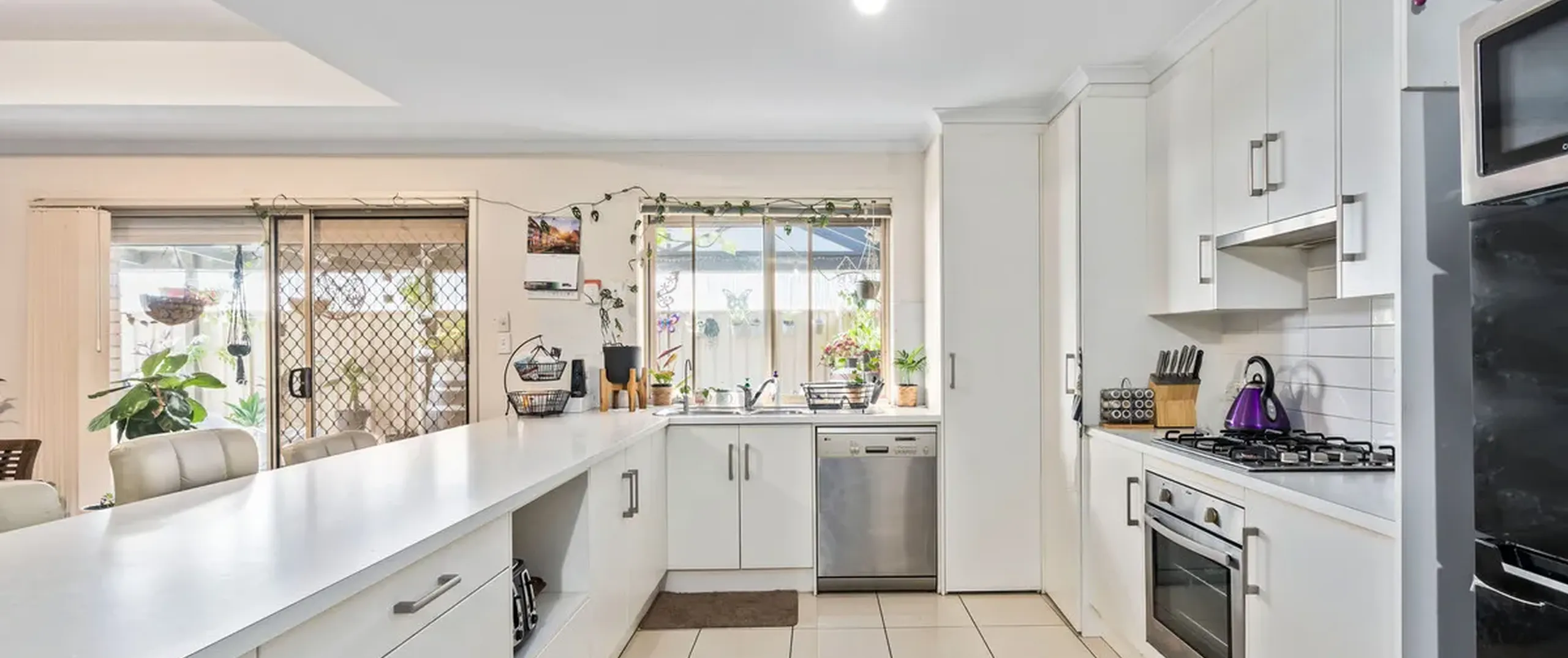 - Kitchen with quality stainless steel appliances, gas cook top, dishwasher and sweeping breakfast bar