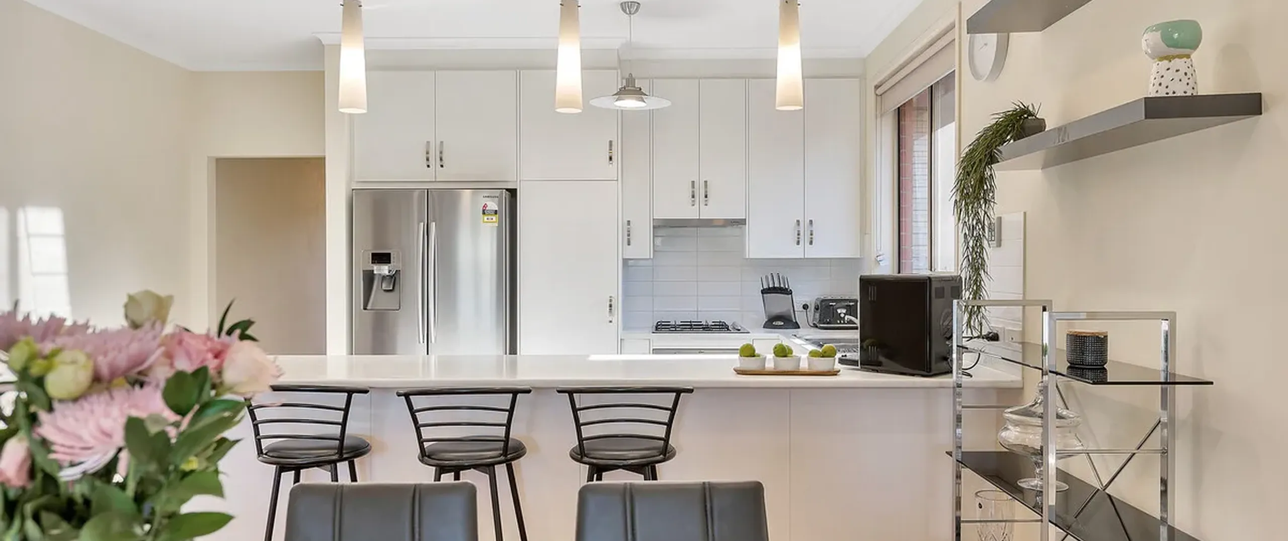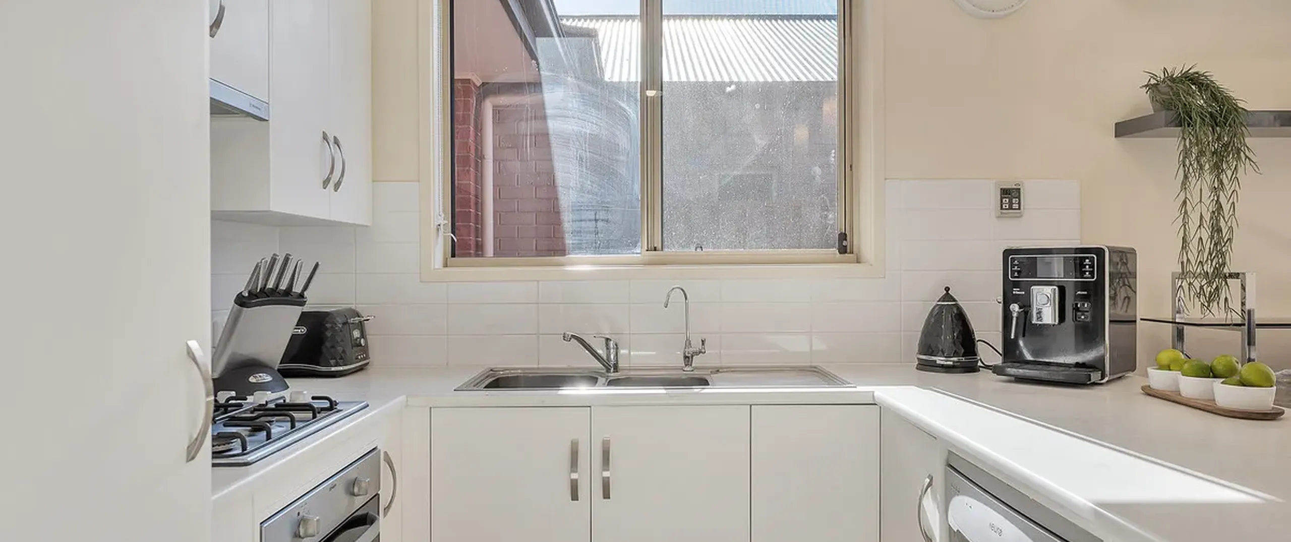 - Modern kitchen with stainless steel appliances and ample cupboard and bench space