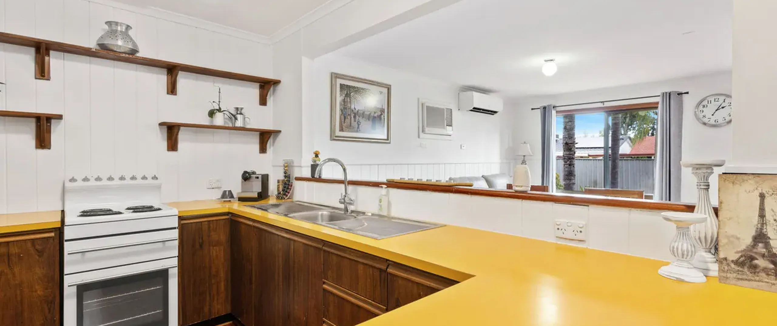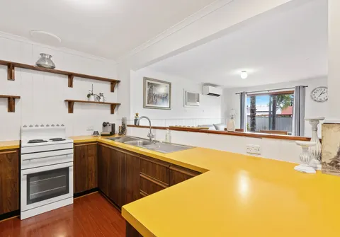 - Practical kitchen with standalone oven and cooktop, ample cupboard, and bench space, complete with server to the living/dining room